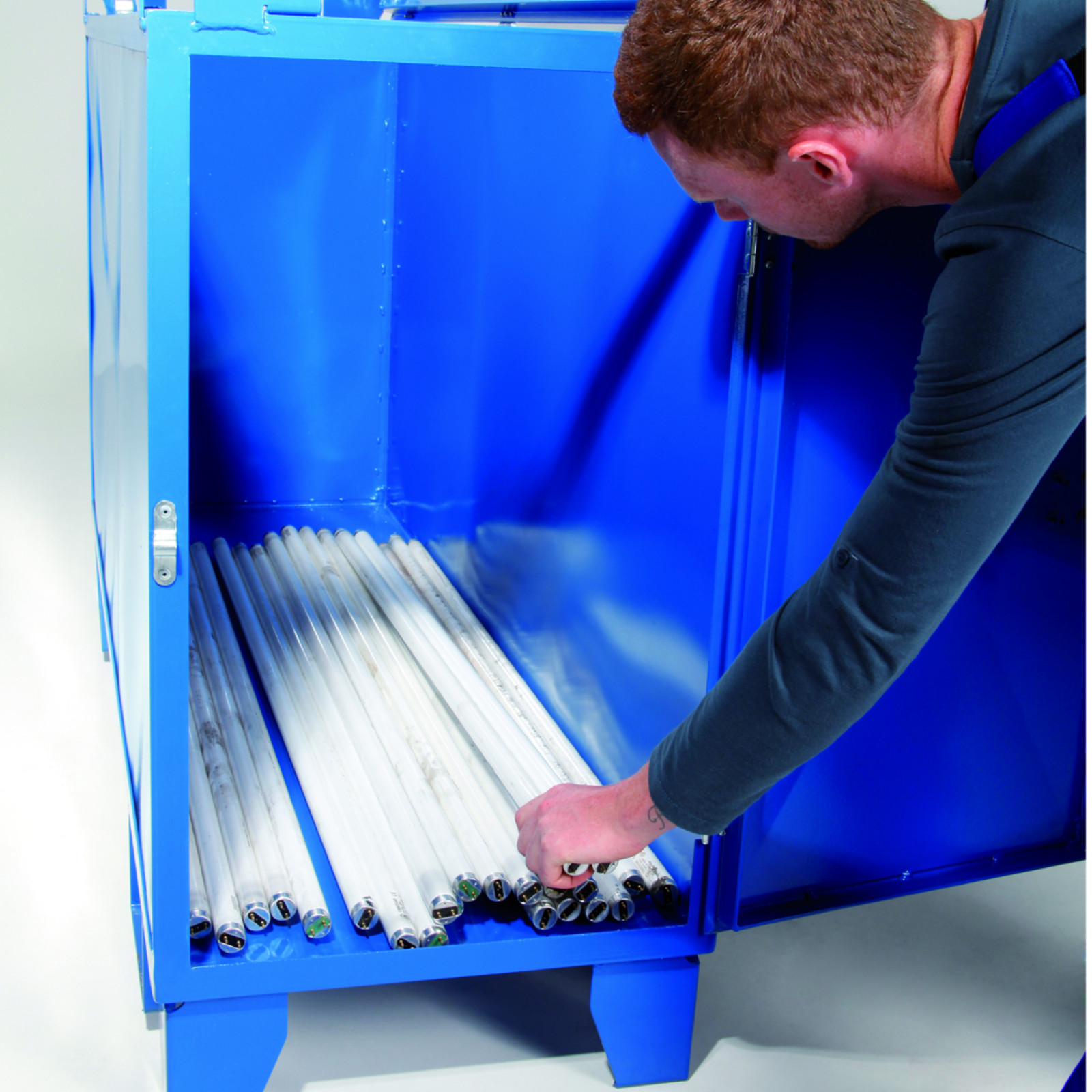 W zestawie znajduje się kontener do zbiórki zużytych świetlówek i żarówek, który spełnia wszystkie wymagane normy i atesty.