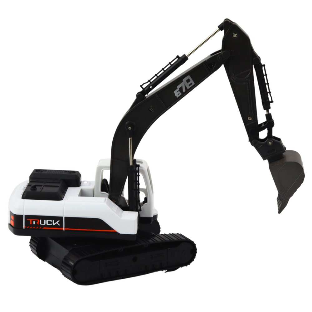 Koparka posiada ruchome przeguby ramienia, które pozwalają na pełną kontrolę podczas załadunku i rozładunku. Dodatkowym atutem jest obrotowa kabina 360°, co jeszcze bardziej uatrakcyjnia zabawę i odzwierciedla sposób działania prawdziwej maszyny. Pojazd porusza się na gąsienicach, dzięki czemu świetnie radzi sobie na różnych powierzchniach – zarówno w domu, jak i na zewnątrz.