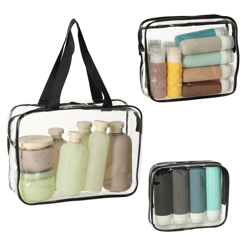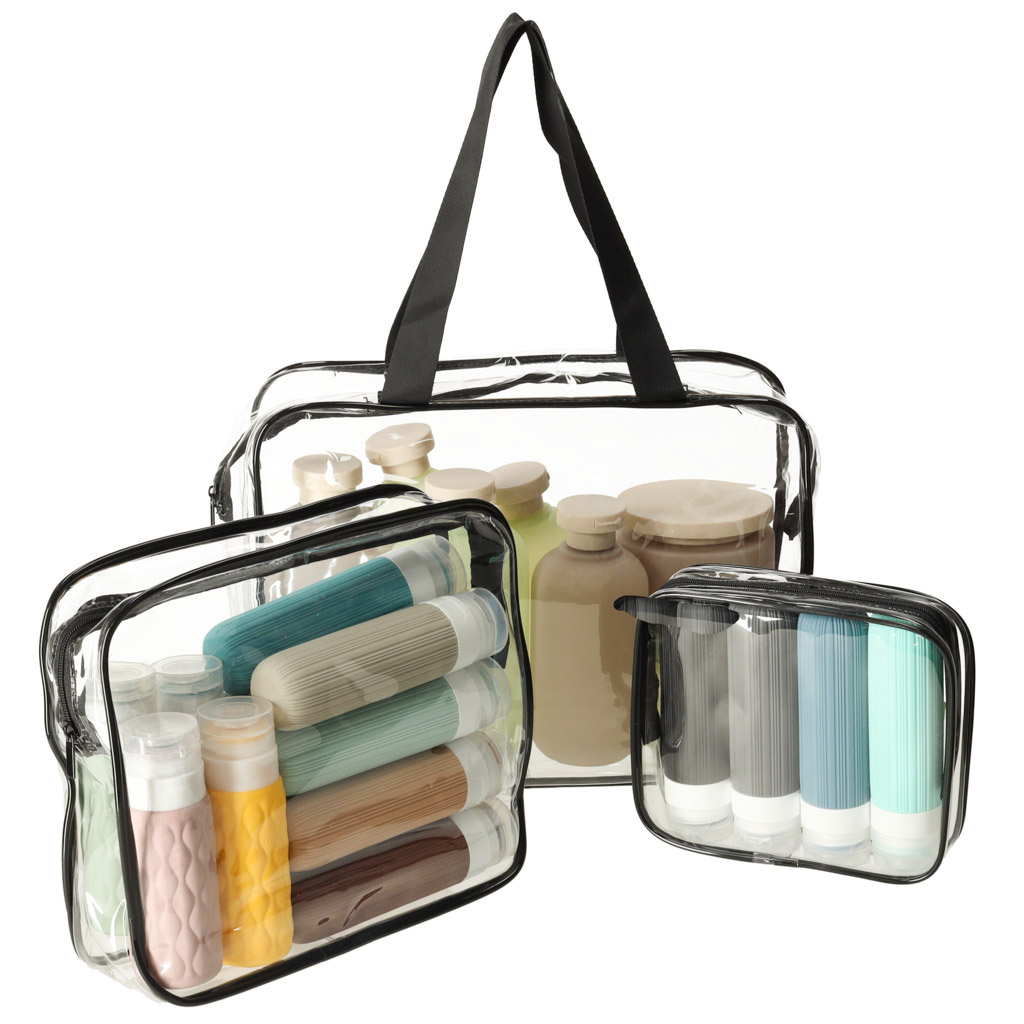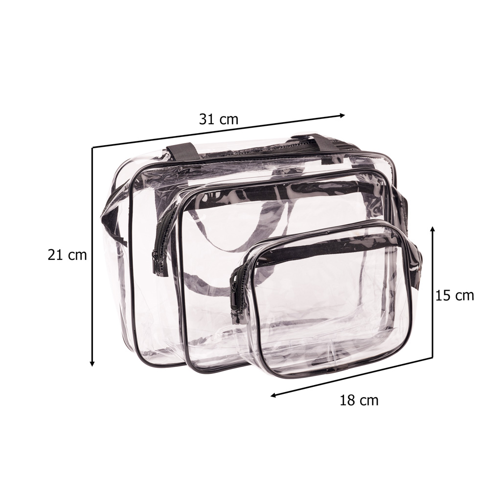 Wykonane z wodoodpornego materiału, kosmetyczki chronią Twoje przedmioty przed rozlaniem się kosmetyków. Przezroczysty materiał umożliwia szybkie odnalezienie potrzebnych rzeczy, co jest szczególnie przydatne podczas odprawy na lotnisku. Po powrocie z podróży, kosmetyczki można schować jedną w drugą, co ułatwia ich przechowywanie.