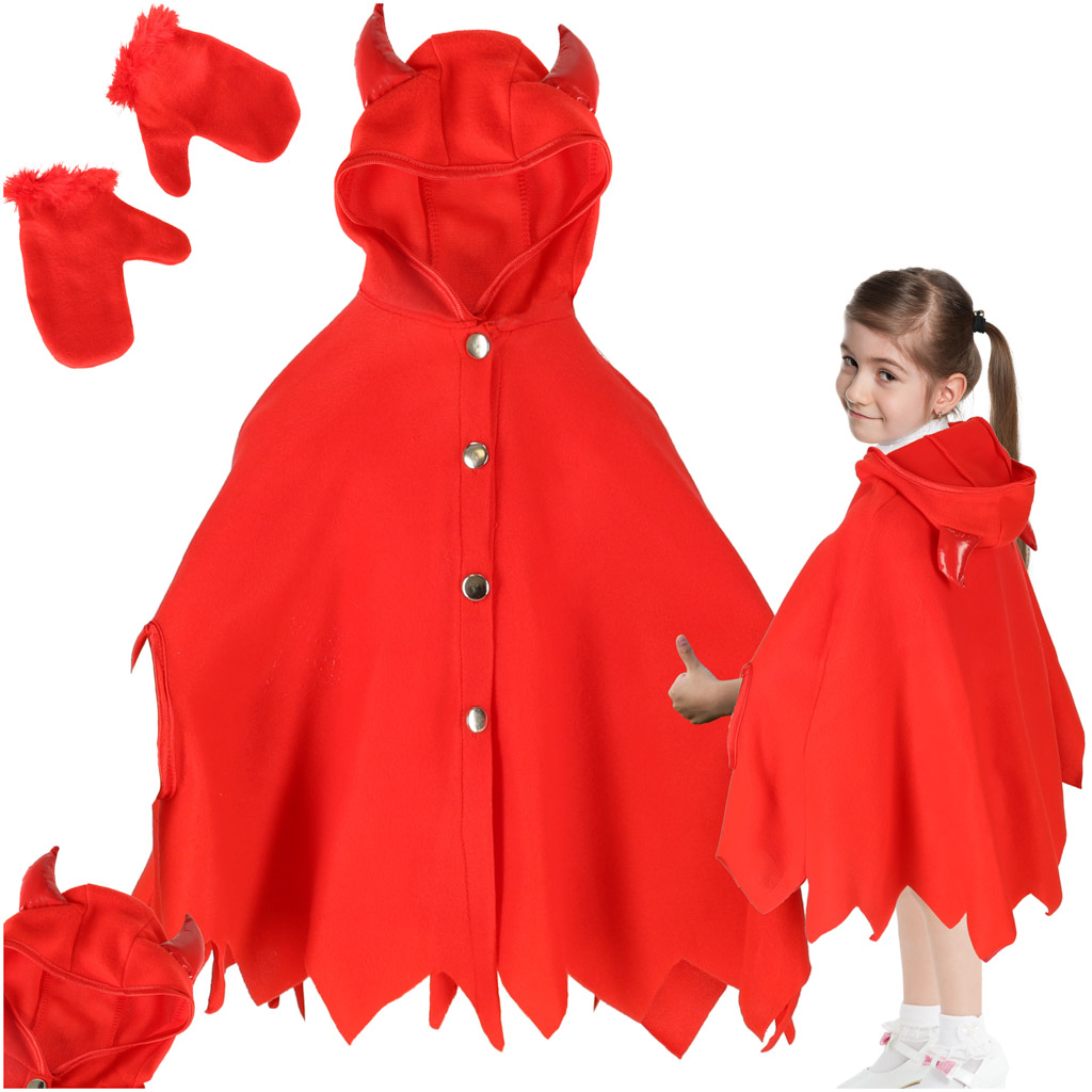 Oferujemy uroczy strój diabełka dla dzieci, idealny na różne okazje. To dwuelementowy zestaw, który składa się z peleryny z kapturem oraz czerwonych rękawiczek. Dzięki temu kostiumowi Twoje dziecko może poczuć się jak odważny diabełek!
