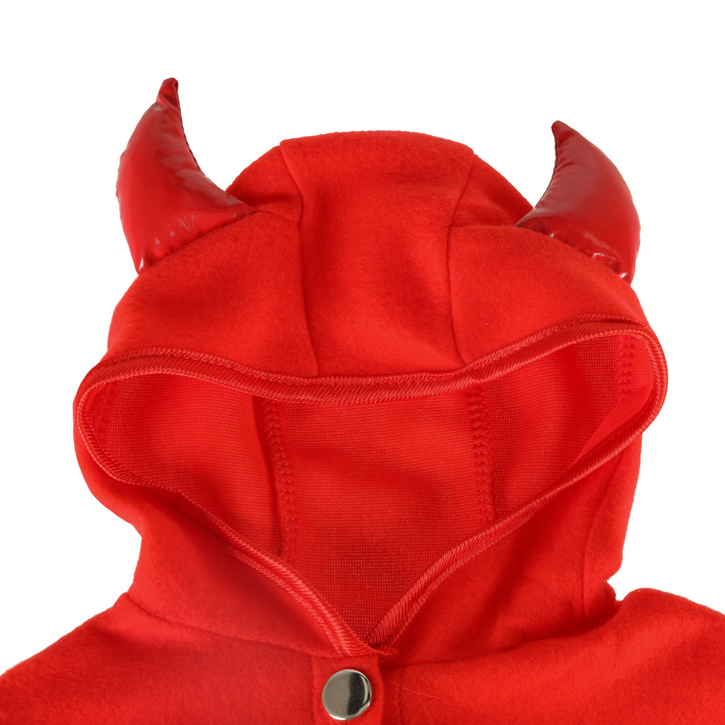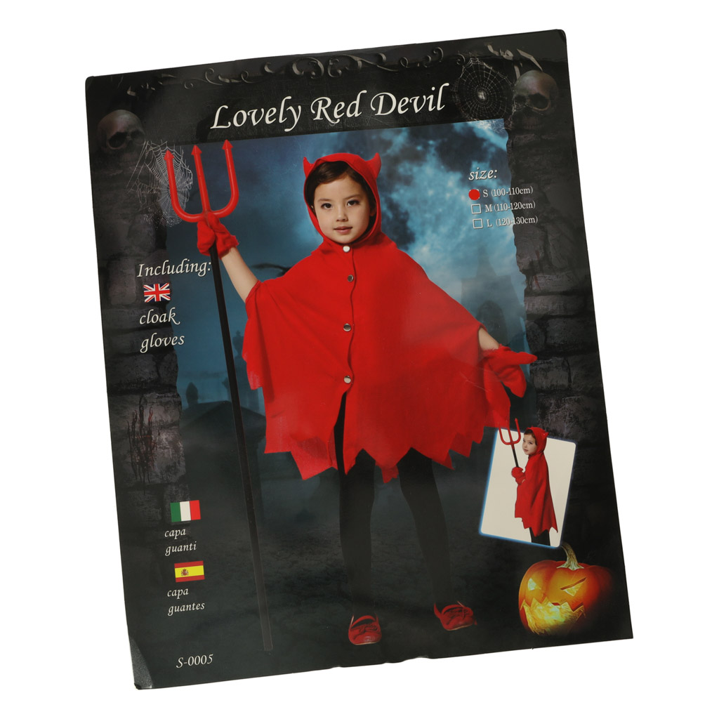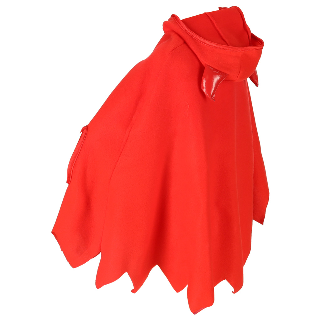 Peleryna wykonana jest z przyjemnego w dotyku materiału, zapinana na cztery zatrzaski i posiada kaptur z rogami. Rękawiczki mają puszek na brzegu, co dodaje uroku całemu przebraniu. Produkt zapakowany jest w foliowe opakowanie, co ułatwia przechowywanie.