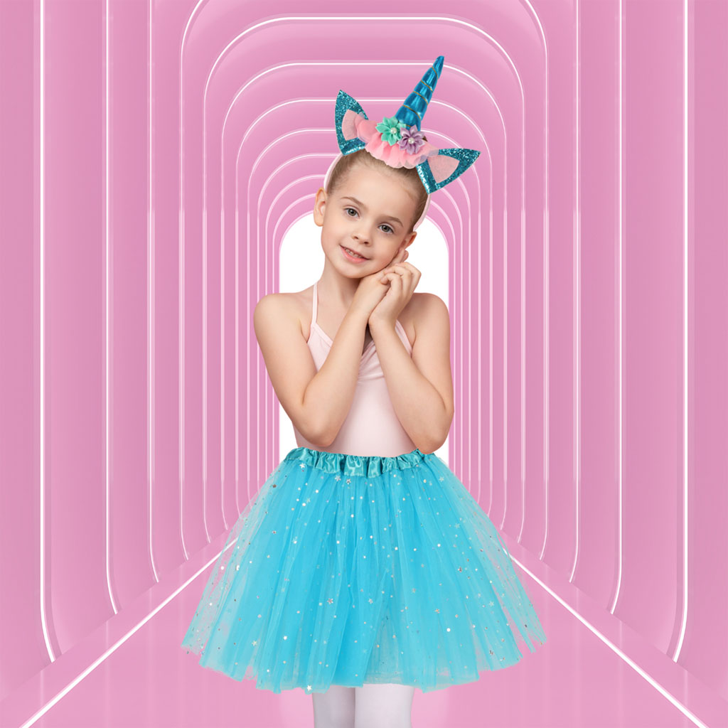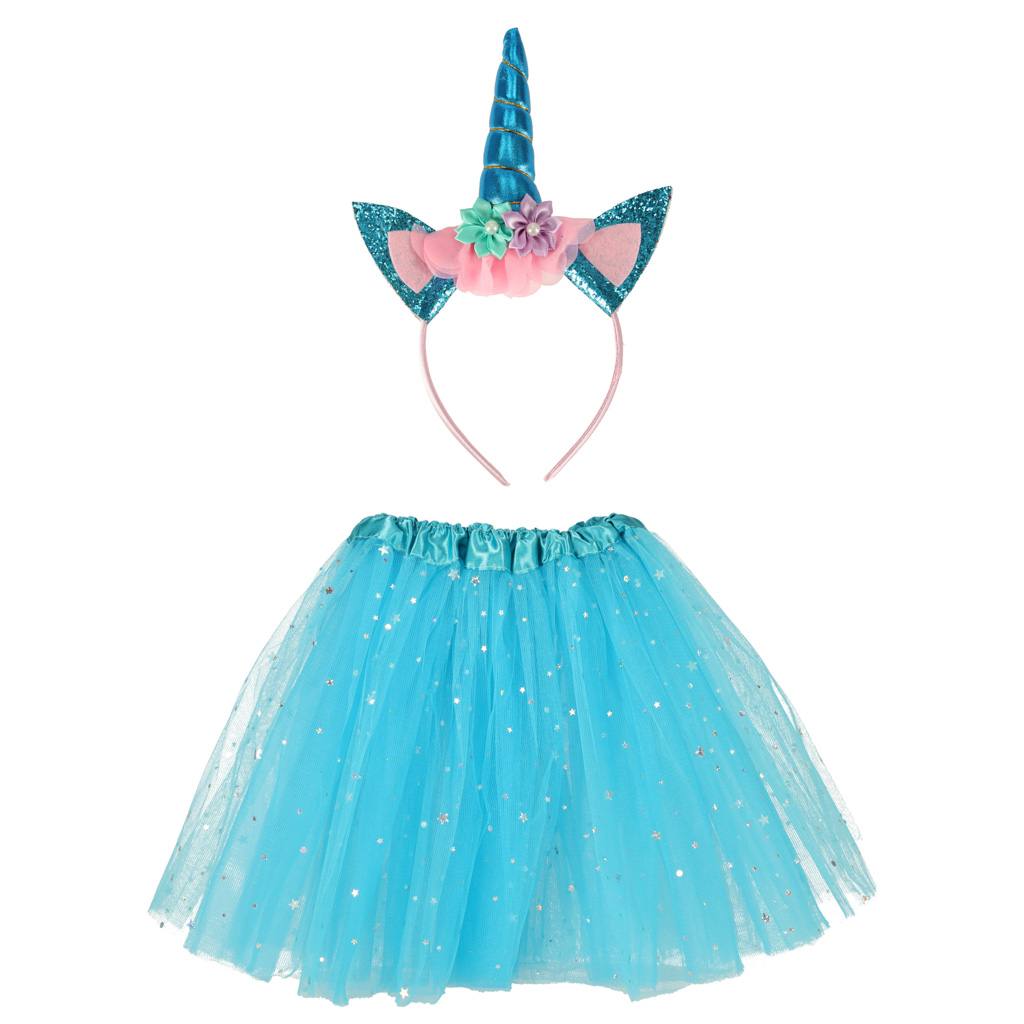 Wprowadź magię do zabawy z tym urokliwym kostiumem jednorożca! Składa się z błękitnej spódniczki księżniczki oraz efektownej opaski z rogiem jednorożca. To idealny wybór dla każdej małej miłośniczki czarów.