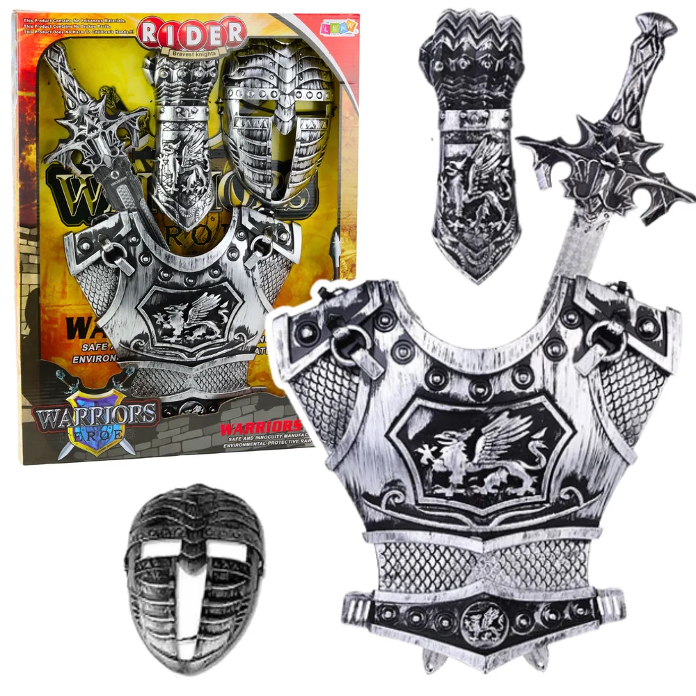 Duży Zestaw Rycerski Maska Zbroja Miecz Ochraniacz Srebrny