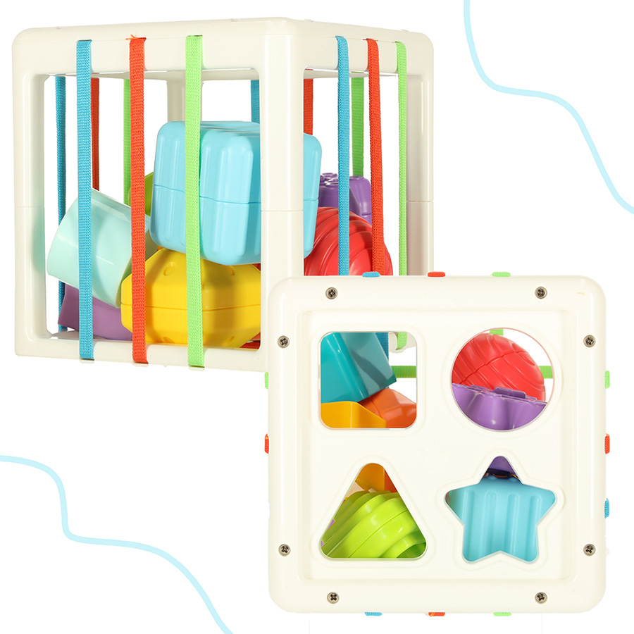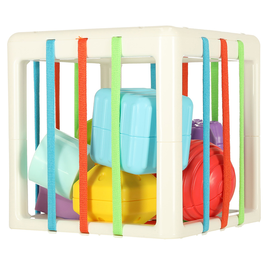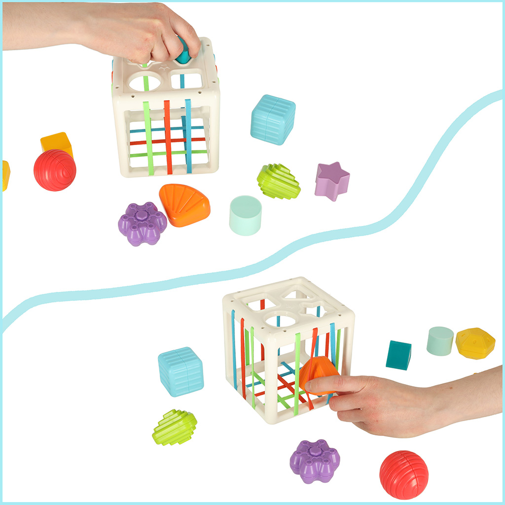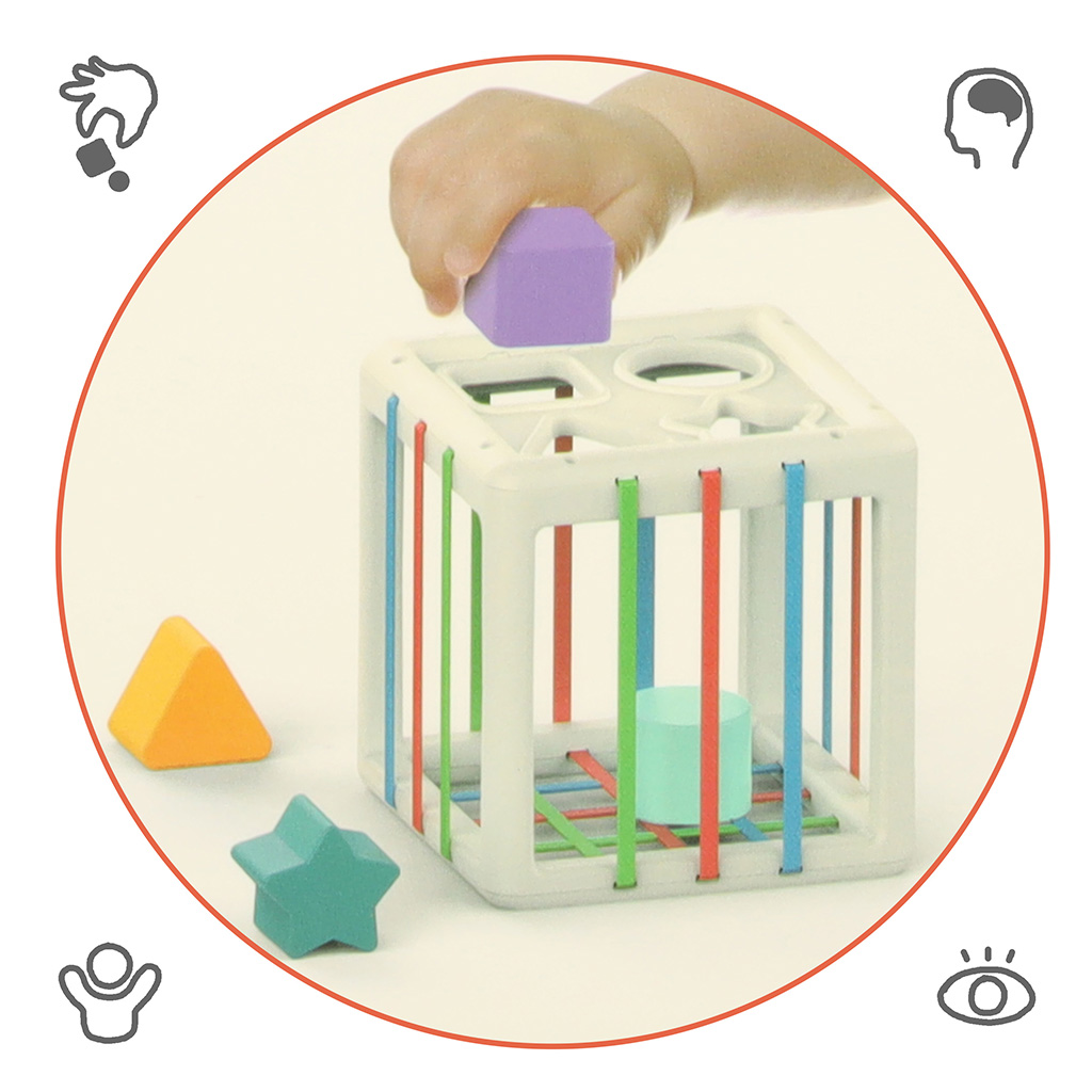 Kostka sorter umożliwia wkładanie kolorowych klocków do środka. Co wyróżnia tę zabawkę? Oprócz tradycyjnych wycięć, posiada także elastyczne gumowe paski, przez które można wciskać klocki. To zapewnia dodatkową różnorodność i wyzwanie.
