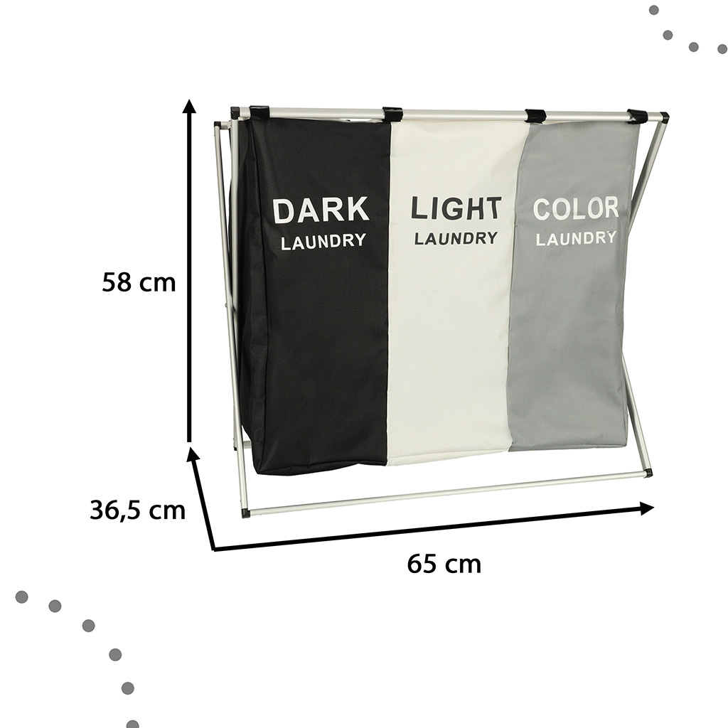 Każda z trzech komór ma pojemność 45 litrów, co łącznie daje aż 135 litrów na przechowywanie brudnych ubrań. Wymiary kosza wynoszą 65 cm x 36,5 cm x 58 cm, co sprawia, że zmieści się w nawet niewielkich pomieszczeniach. Jego wąska konstrukcja pozwala na łatwe umiejscowienie w łazience czy garderobie, zyskując jednocześnie dodatkowe miejsce.