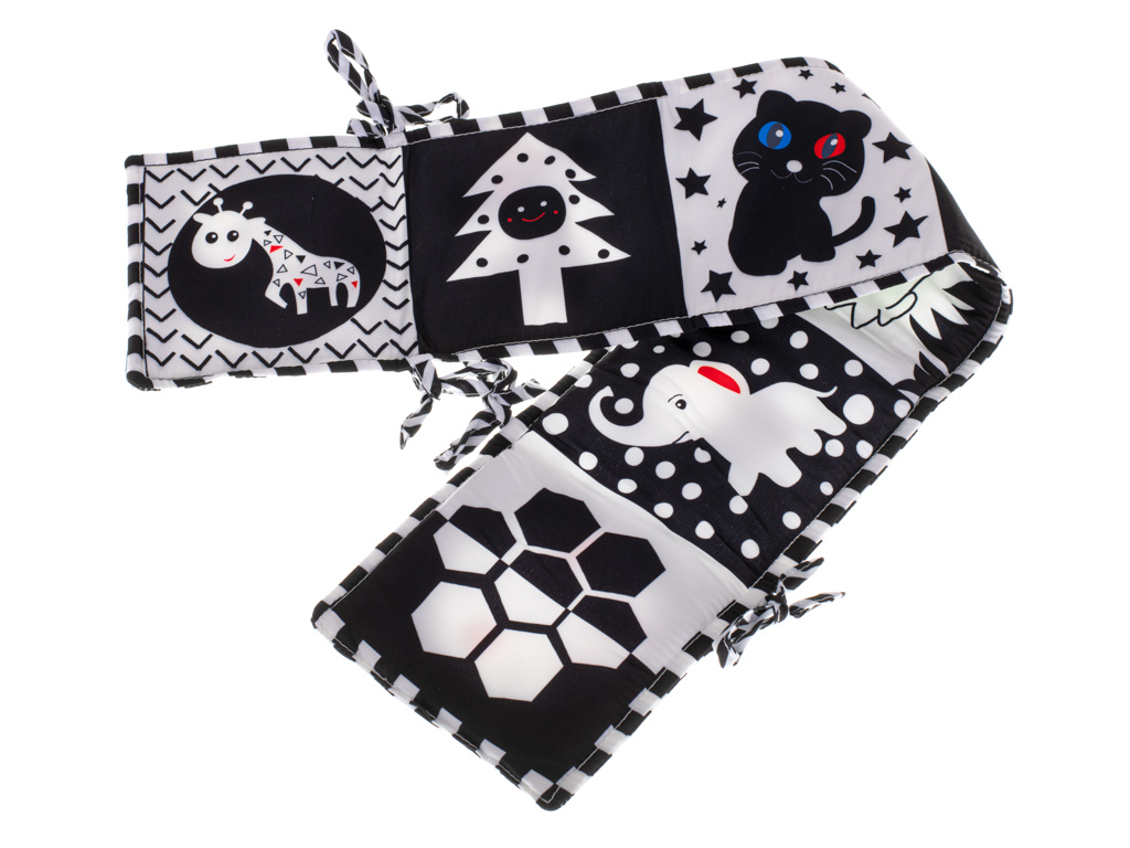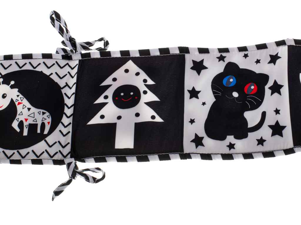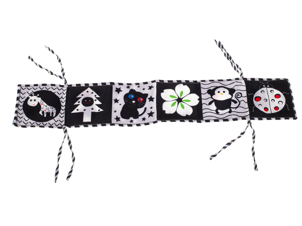 Książeczka w formie harmonijki sprawdzi się jako mata ochronna do łóżeczka. Dzięki sznureczkom można ją łatwo przymocować do szczebelków. Wszystkie strony są zszyte, co pozwala na wygodne rozłożenie i zabawę.