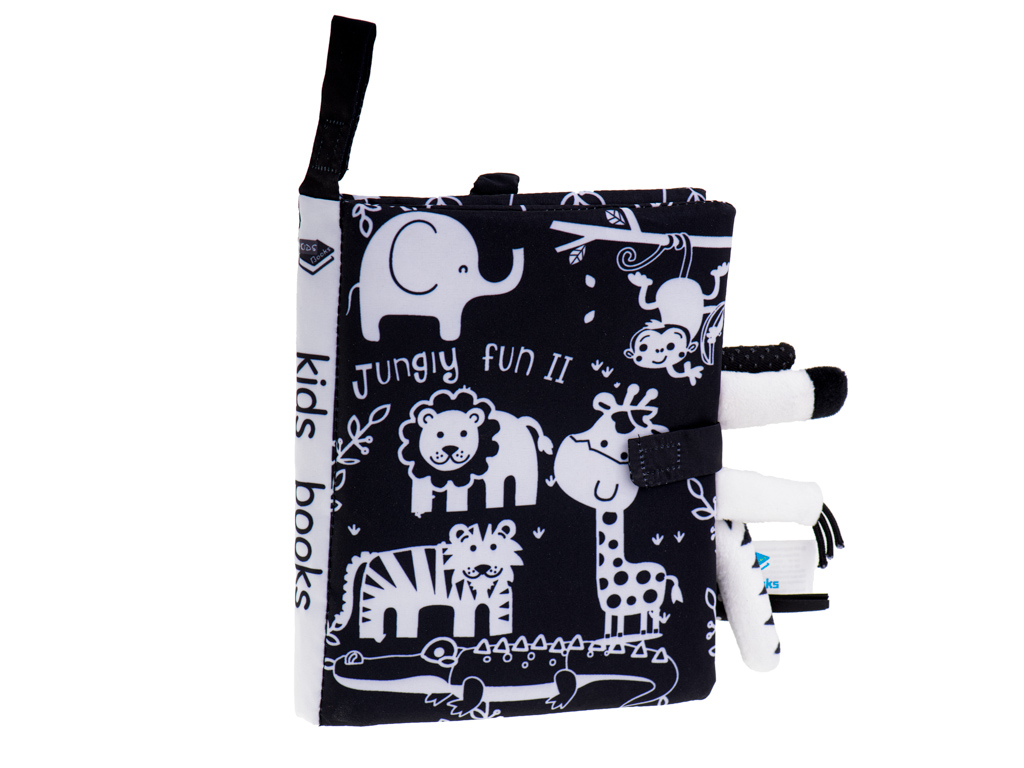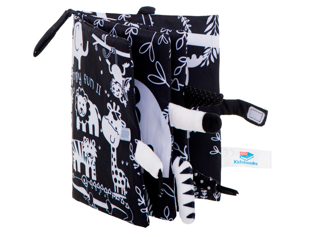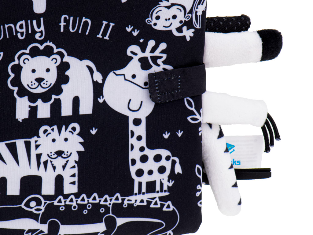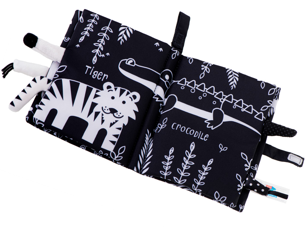Książeczka wykonana z materiału w kontrastowe wzory przyciąga uwagę malucha. Biało-czarne zwierzątka to wspaniały sposób na zapoznanie dzieci ze światem przyrody. Wewnątrz znajdziesz cztery strony, które przedstawiają: