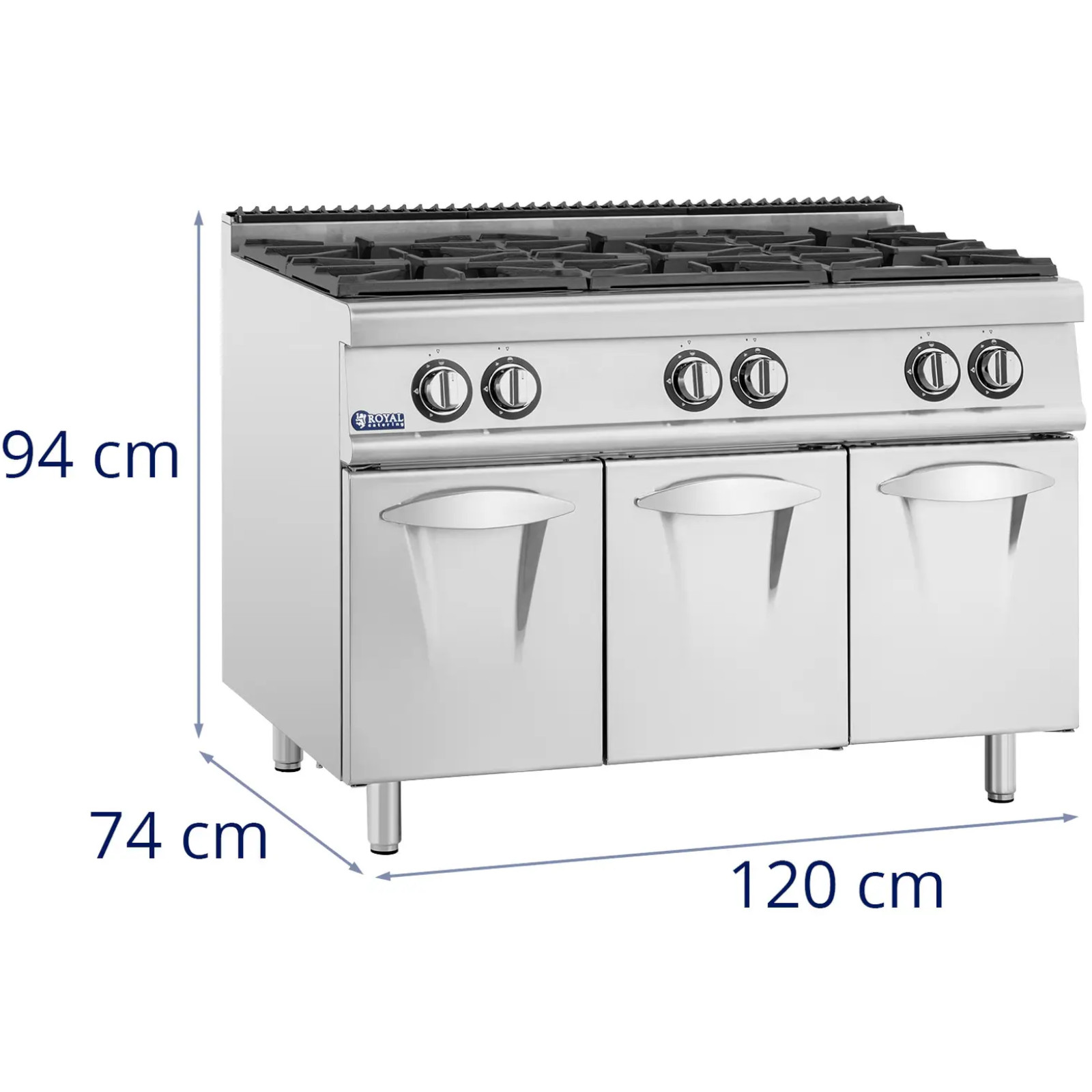 Kuchenka została wyposażona w sześć palników, a pod nimi znajduje się pojemna szafka, która pomieści garnki, patelnie i inne przybory kuchenne, chroniąc je przed kurzem. Szafka otwierana jest za pomocą drzwi na zawiasach, co ułatwia dostęp do przechowywanych przedmiotów.