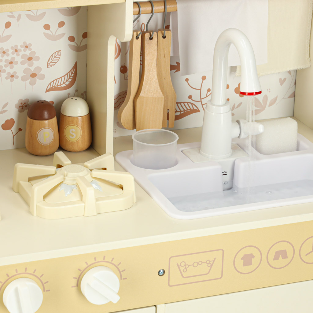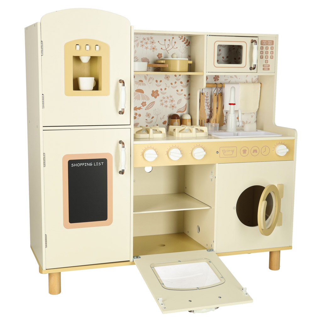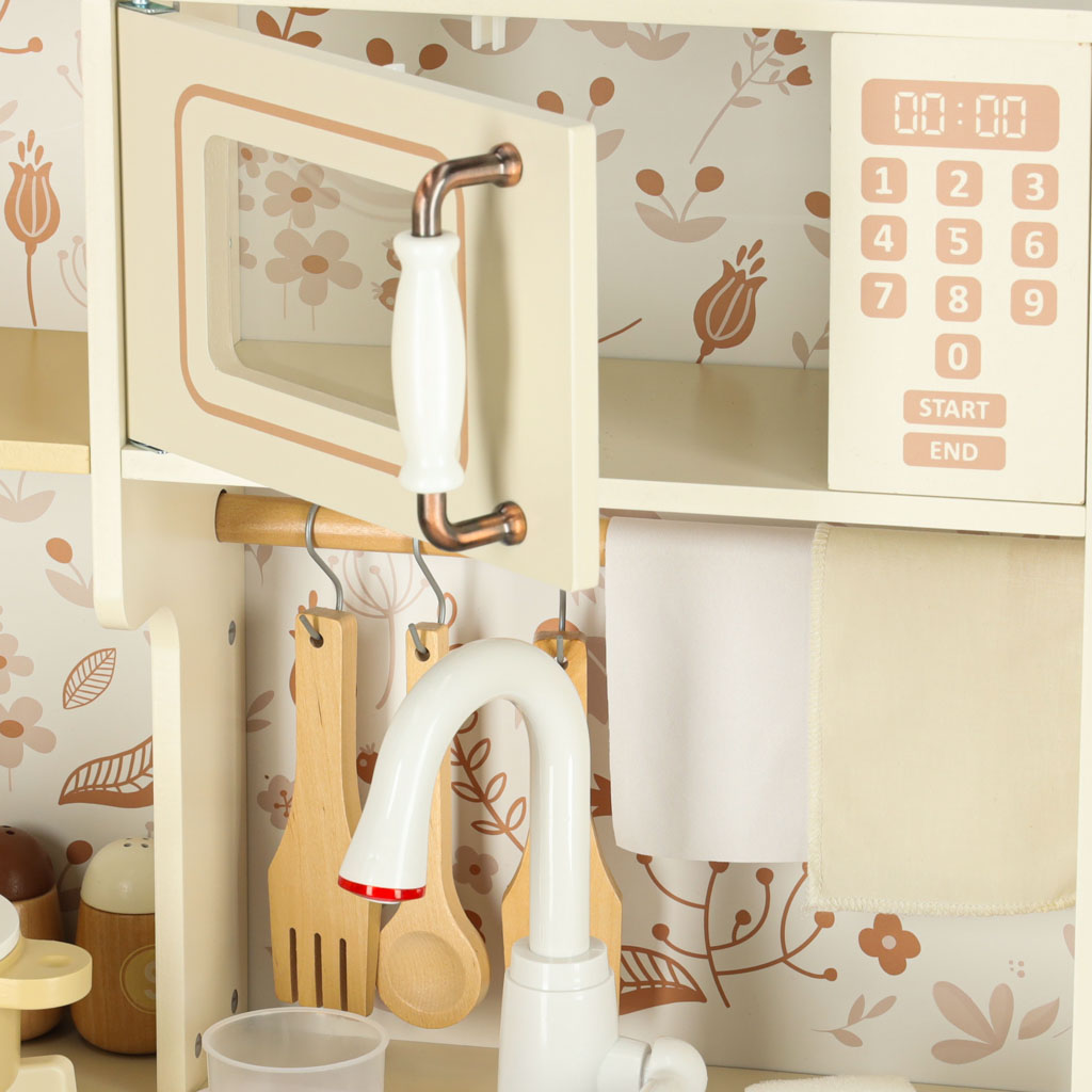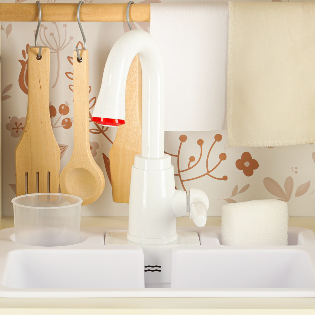 Kuchnia zawiera pełen zestaw akcesoriów, w tym filiżankę, garnek, patelnię, szpatułki, solniczkę i pieprzniczkę, a także pralkę, mikrofalówkę, piekarnik oraz zlew z funkcją lania wody. Dzięki temu dzieci uczą się swobodnego poruszania się i dbania o porządek w swojej kuchennej przestrzeni.