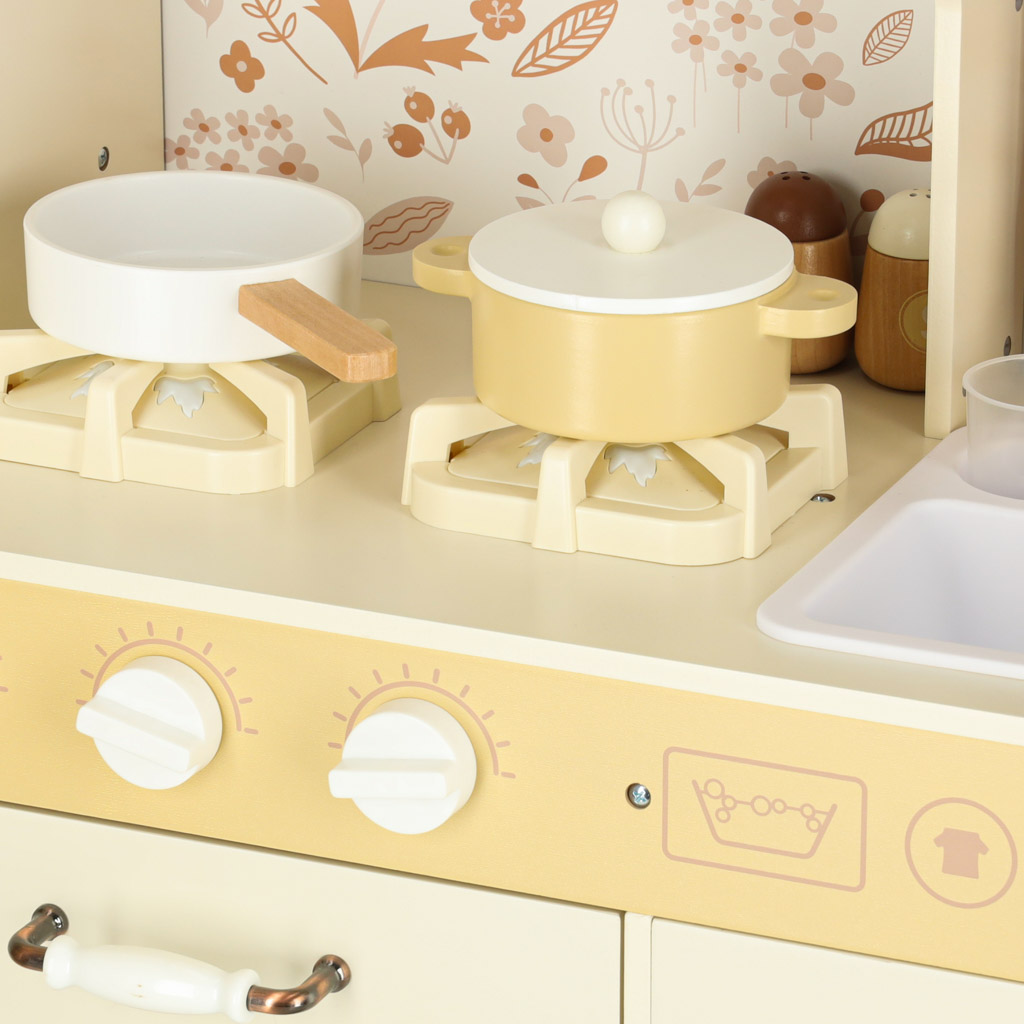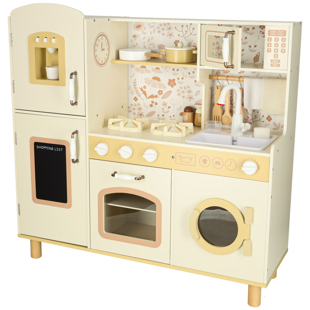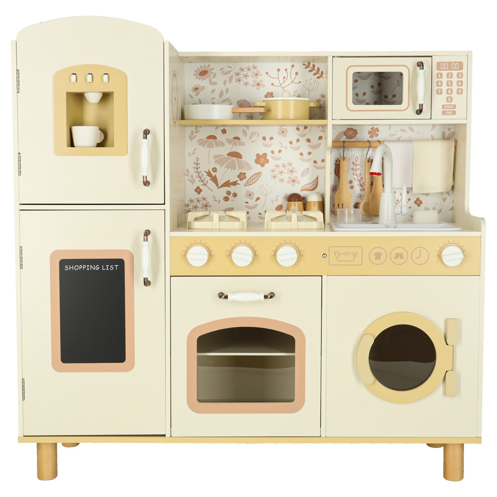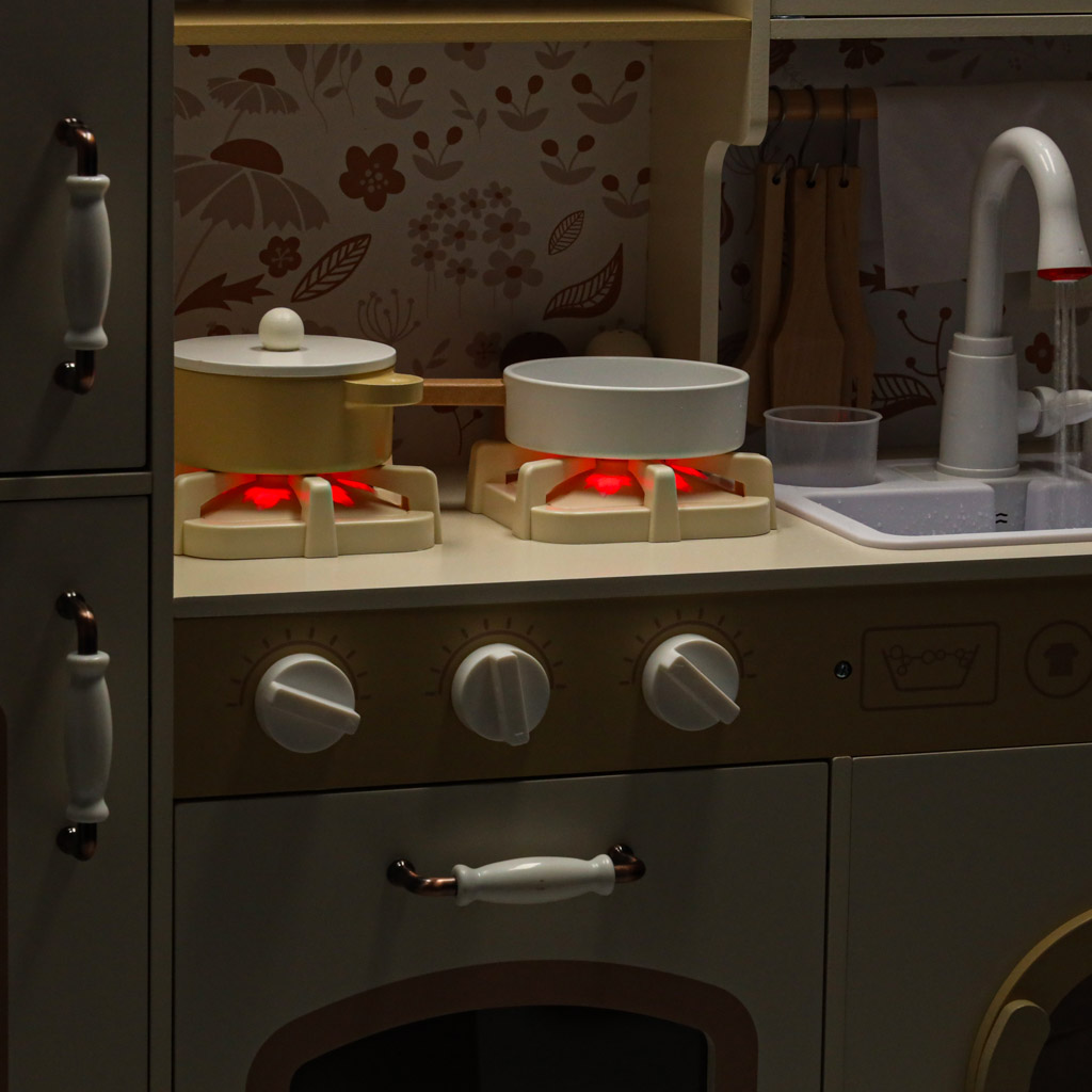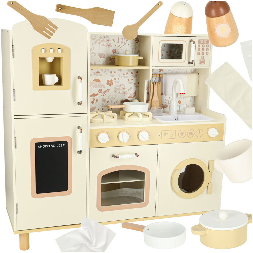 Kuchnia zawiera pełen zestaw akcesoriów, w tym filiżankę, garnek, patelnię, szpatułki, solniczkę i pieprzniczkę, a także pralkę, mikrofalówkę, piekarnik oraz zlew z funkcją lania wody. Dzięki temu dzieci uczą się swobodnego poruszania się i dbania o porządek w swojej kuchennej przestrzeni.
