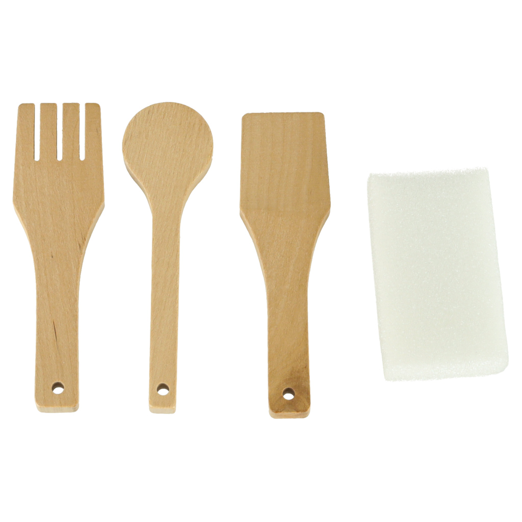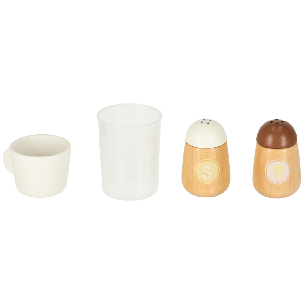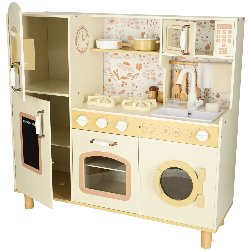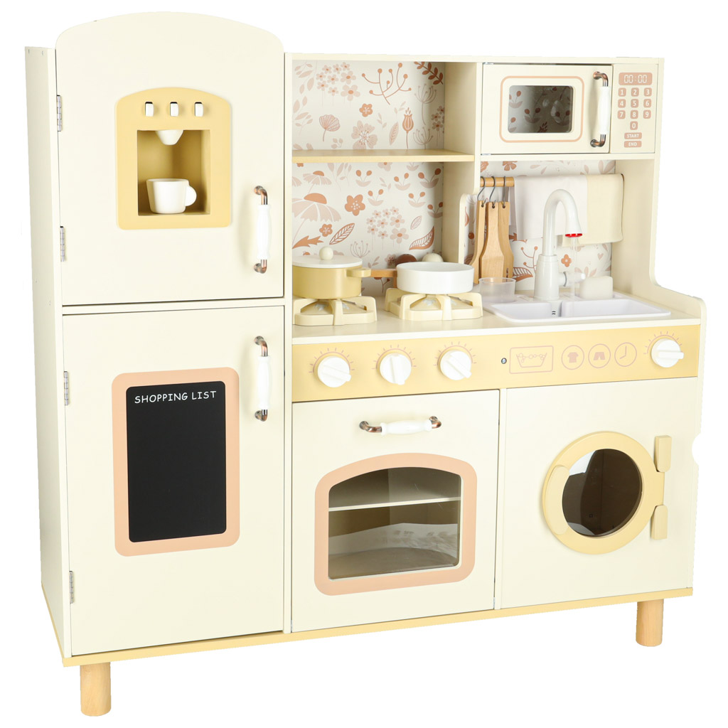 Kuchnia zawiera pełen zestaw akcesoriów, w tym filiżankę, garnek, patelnię, szpatułki, solniczkę i pieprzniczkę, a także pralkę, mikrofalówkę, piekarnik oraz zlew z funkcją lania wody. Dzięki temu dzieci uczą się swobodnego poruszania się i dbania o porządek w swojej kuchennej przestrzeni.