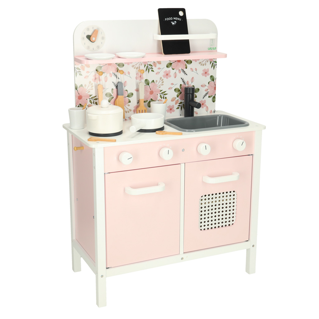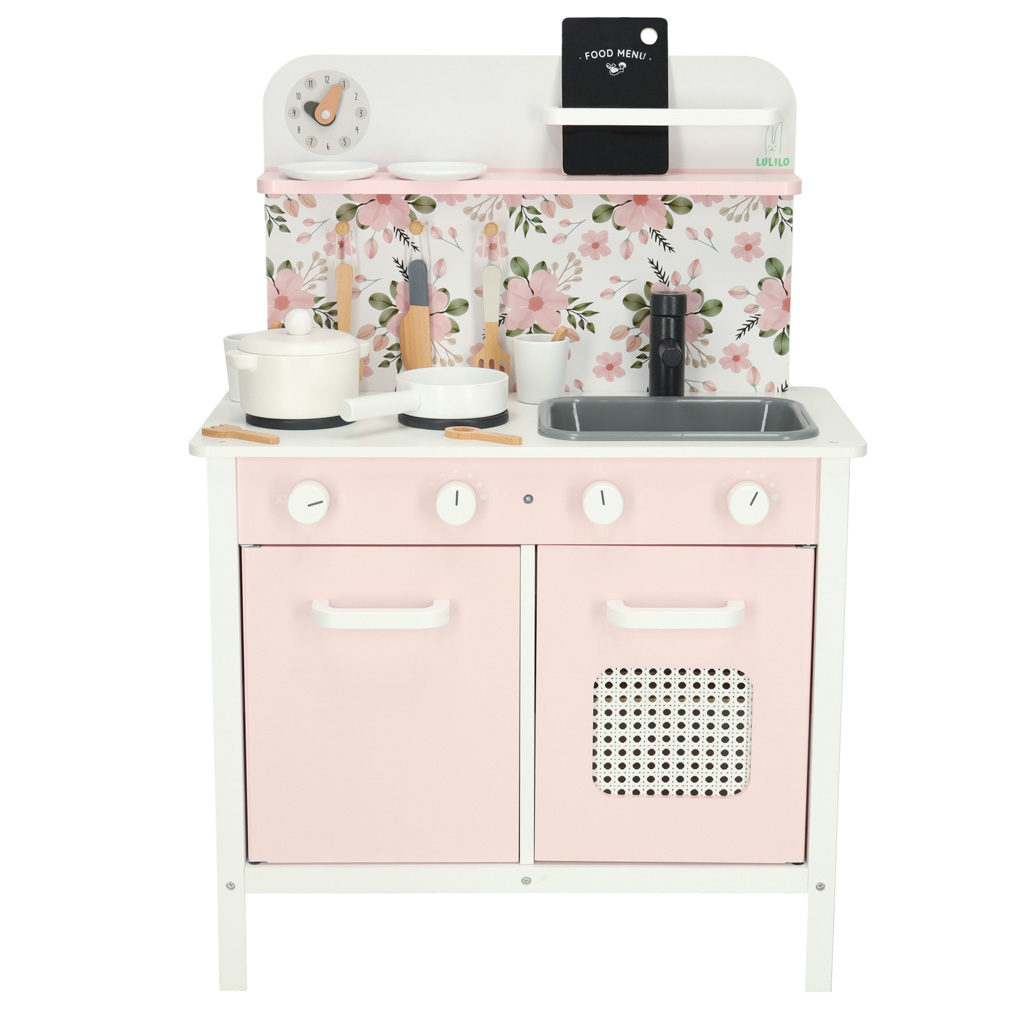Drewniana kuchnia LULILO FLORA w różowym kolorze to idealna zabawa dla małych kucharzy. Dzięki niej dzieci mogą rozwijać swoją kreatywność i wyobraźnię, wcielając się w różne role, takie jak kucharz czy kelner. Zabawa w kuchni to nie tylko przyjemność, ale również nauka codziennych umiejętności związanych z gotowaniem i sprzątaniem.