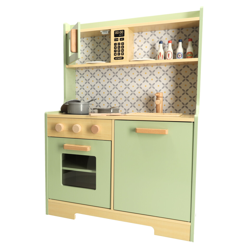 Ta drewniana kuchnia wyposażona jest w wszystko, co potrzebne młodemu kucharzowi. Ruchome pokrętła na kuchence wydają dźwięki, co sprawia, że zabawa staje się jeszcze bardziej realistyczna. Duży piekarnik pozwala na pieczenie ciasteczek, a zlew umożliwia łatwe sprzątanie po zabawie.