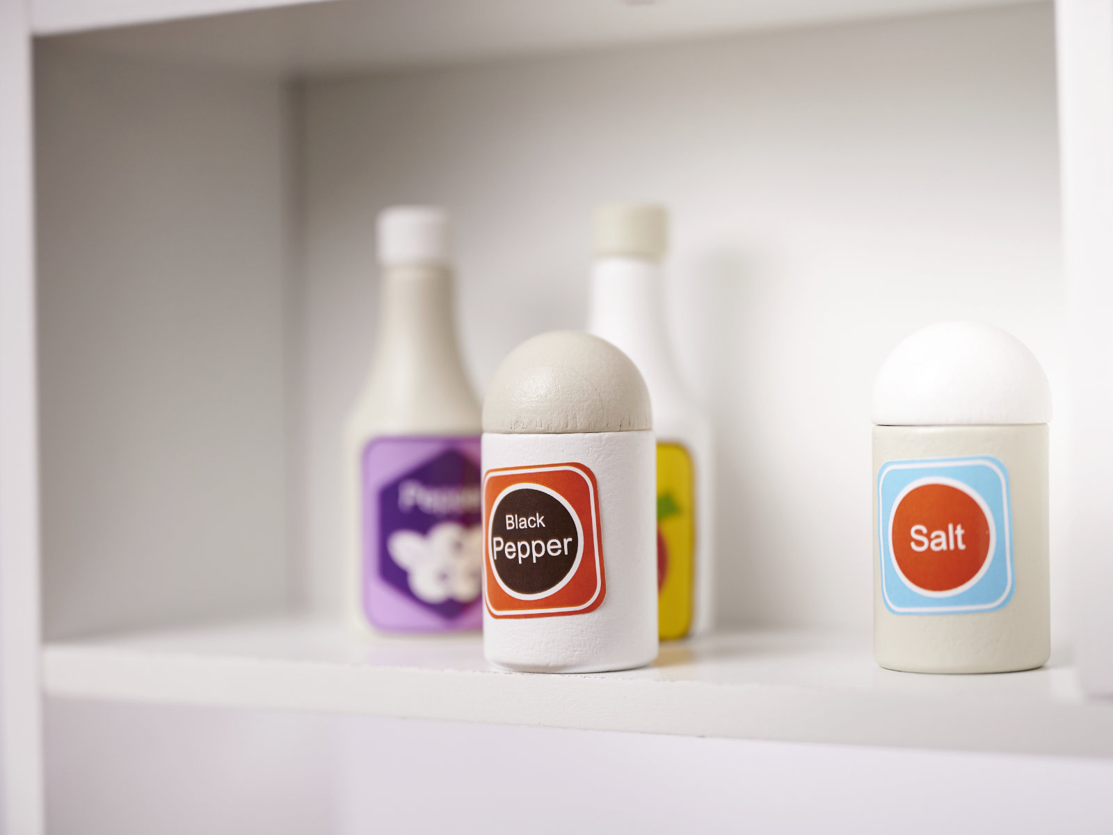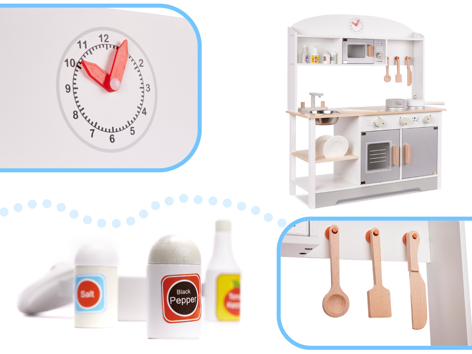 Wszystkie elementy, z wyjątkiem zlewu, są wykonane z drewna, a całość pokryto nietoksyczną farbą, co zapewnia bezpieczeństwo podczas zabawy.