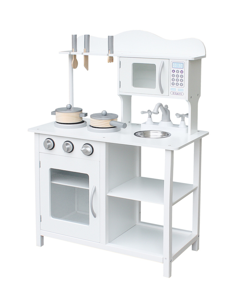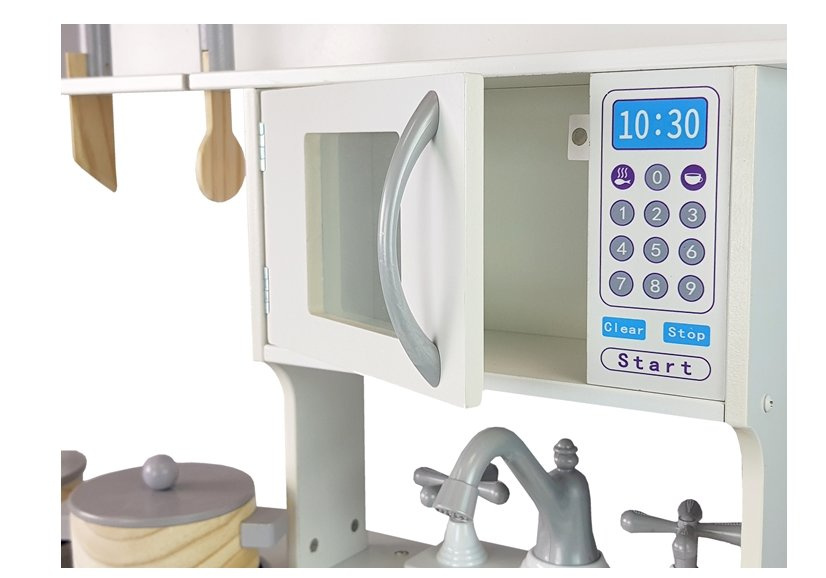 Kuchnia posiada wiele pokręteł i drzwiczek co sprawi, że kilkulatek rozwinie swe umiejętności motoryczne i odruch chwytania przedmiotów o różnym kształcie. Cała kuchnia ma kolor biały z szarymi pokrętłami i uchwytami. Blat ma kolor biały znajduje się na nim zlewozmywak i palniki, na który można gotować cudne potrawy. Nad zlewozmywakiem zamontowana jest mikrofalówka z otwieranymi drzwiczkami i dwoma pokrętłami. Półeczki pod spodem i szafeczka z otwieranymi drzwiczkami pozwolą na utrzymanie porządku oraz przechowywanie garnków i produktów spożywczych. Do całości zestawu dołączone są super elementy, dzięki którym można przygotować śniadanie. Idealnie wpasuje się do każdego wnętrza, a zwłaszcza do pokoju dziecięcego.