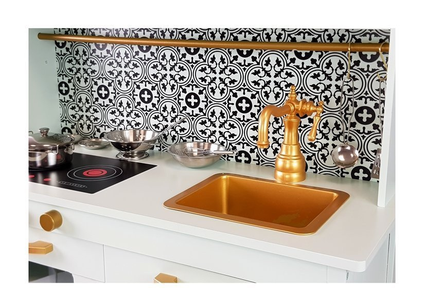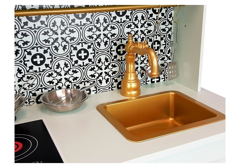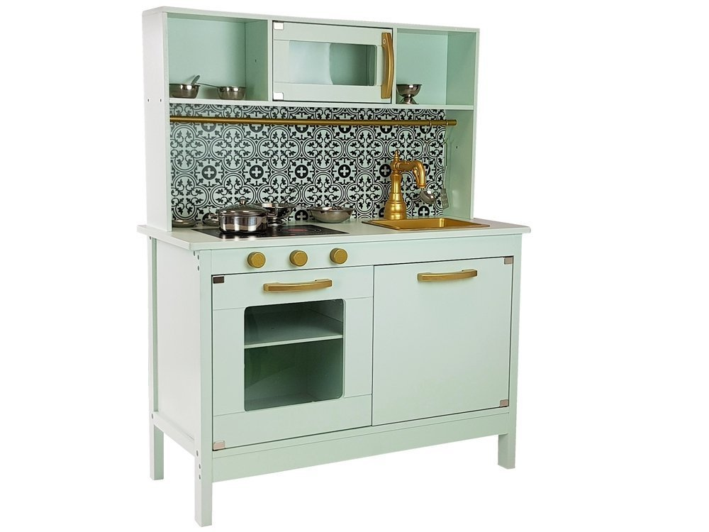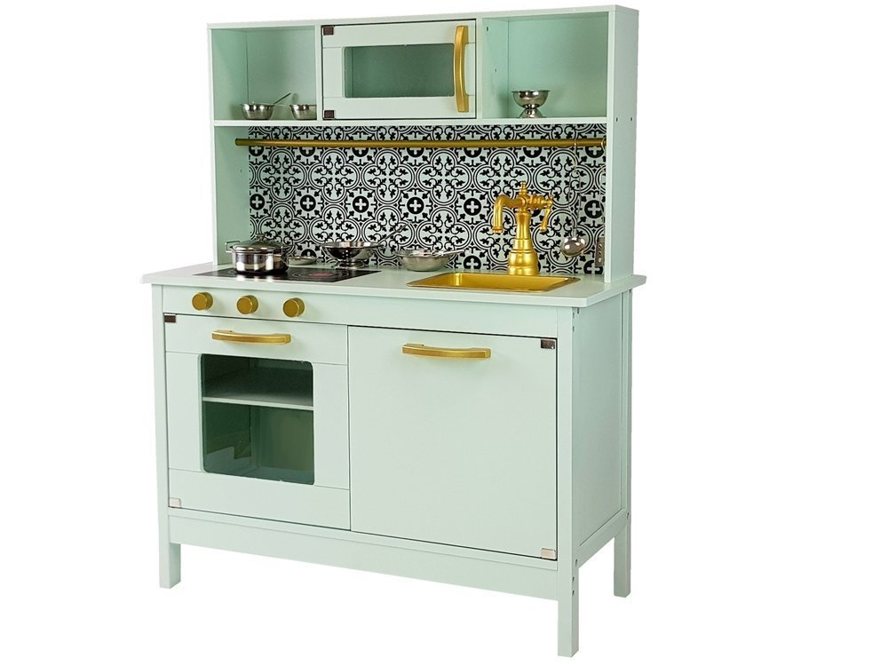 Kuchnia posiada wiele pokręteł i drzwiczek co sprawi, że kilkulatek rozwinie swe umiejętności motoryczne i odruch chwytania przedmiotów o różnym kształcie. Cała kuchnia ma kolor miętowy z pięknymi złotymi pokrętłami i niespotykanym kranem. Blat ma również kolor miętowy znajduje się na nim zlewozmywak i palniki, na który można gotować cudne potrawy. Nad zlewozmywakiem zamontowane są szafki, jedna z nich ma szybę i otwierane drzwiczki. Półeczki pod spodem pozwolą na utrzymanie porządku oraz przechowywanie wielu garnków i produktów spożywczych. Do całości zestawu dołączone są super akcesoria do kuchni, dzięki którym można przygotować śniadanie, czy obiad. Pomiędzy górnymi i dolnymi szafkami jest piękny czarno- biały wzór, który zachwyci małego kucharza. Idealnie wpasuje się do każdego wnętrza, a zwłaszcza do pokoju dziecięcego.