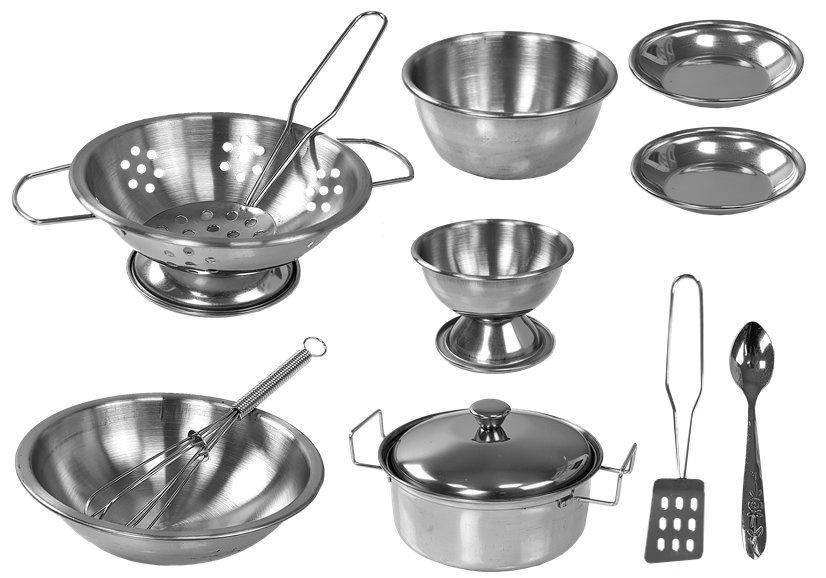 - akcesoria kuchenne nierdzewne: durszlak, garnek z pokrywką, rondelek, talerzyki, miska, sztućce