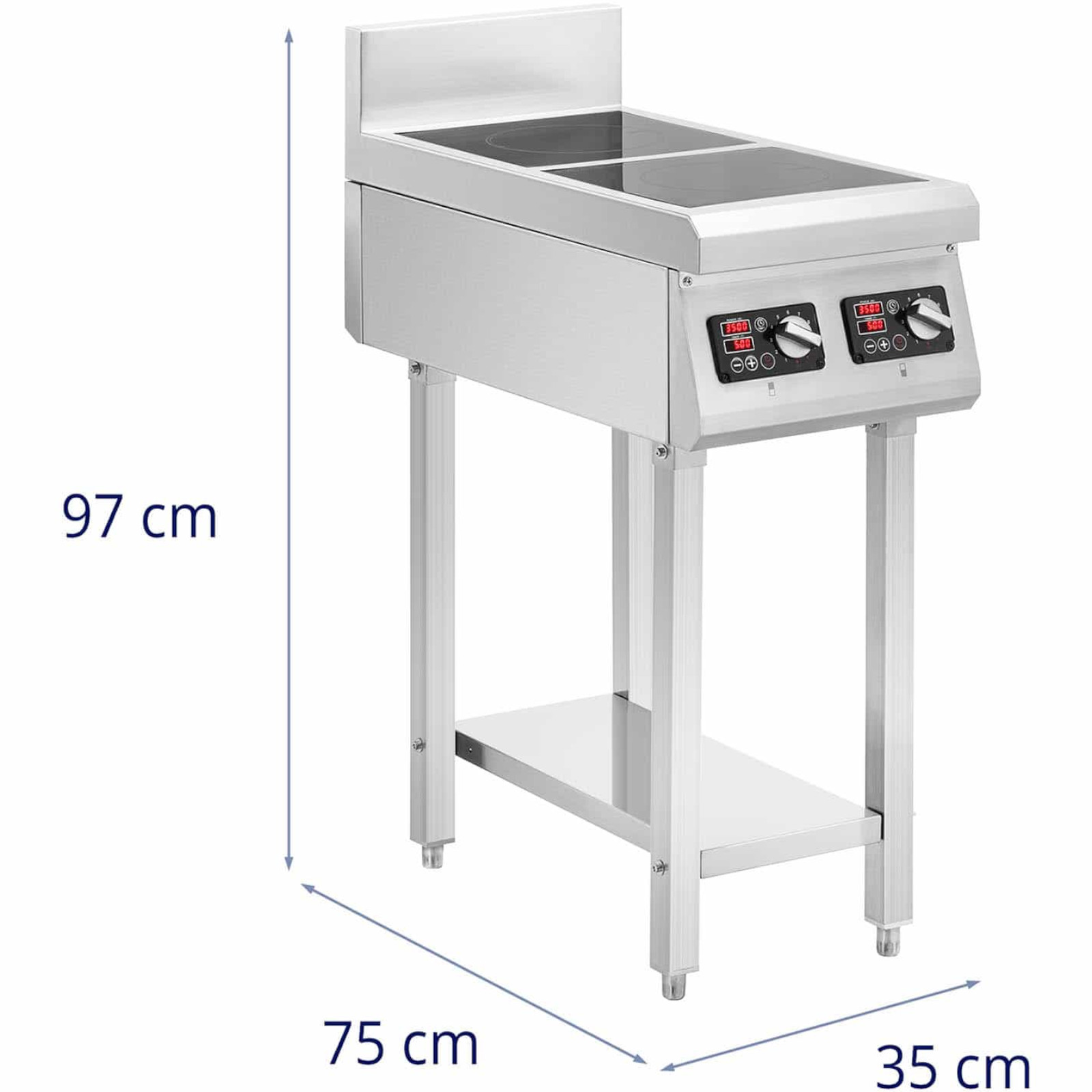 Dla bezpieczeństwa użytkowania, kuchenka posiada funkcję automatycznego wyłączenia po 4 godzinach pracy w trybie czuwania. Jej obudowa oraz podstawa wykonane są ze stali nierdzewnej, co zapewnia trwałość i łatwość w utrzymaniu czystości. Wymiary podstawy wynoszą 57 x 22 cm, a regulowane nóżki (3 cm) zapewniają stabilność na nierównych powierzchniach.