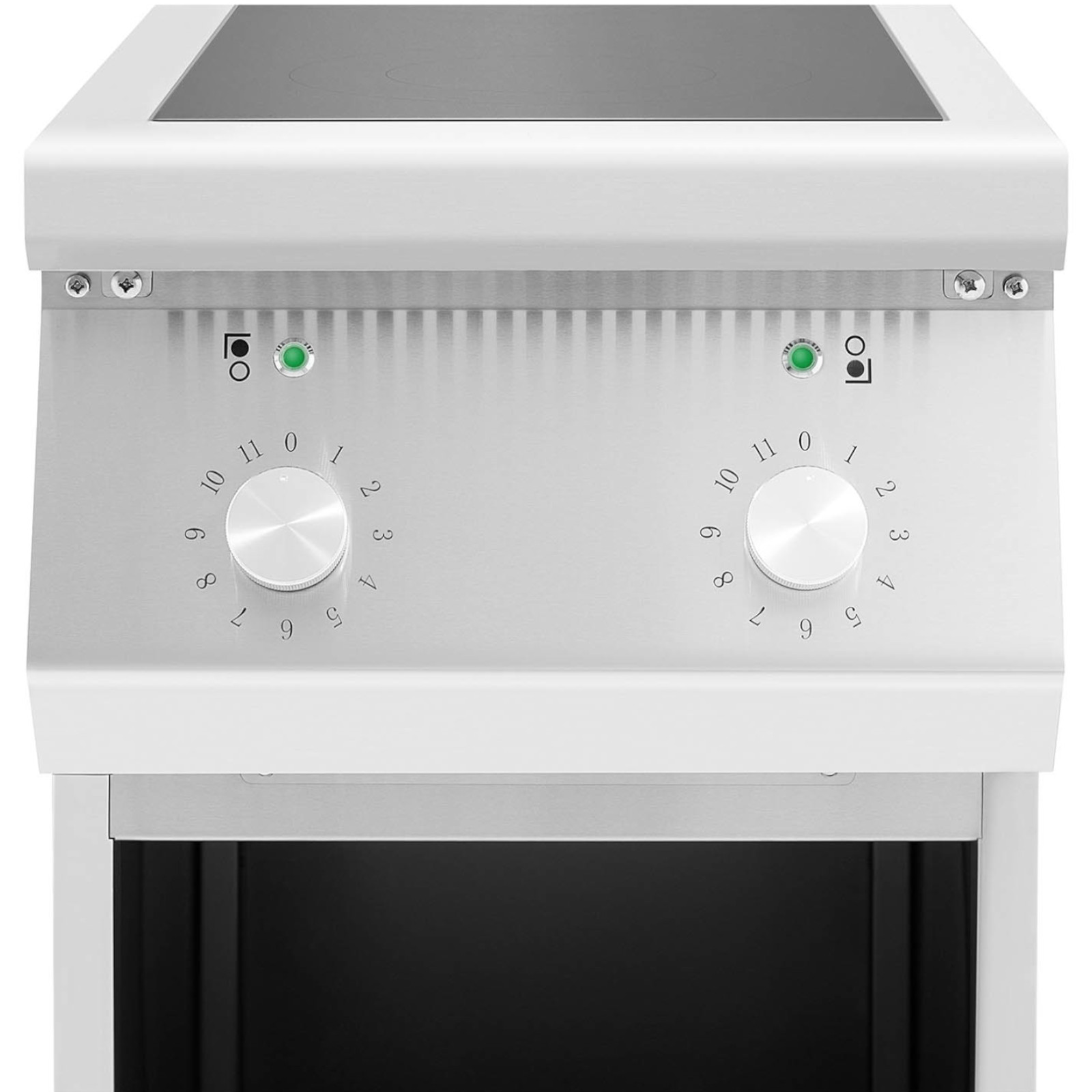 Urządzenie oferuje maksymalną temperaturę grzania do 260°C i proste w obsłudze pokrętła do ustawiania parametrów. Posiada dwa pola grzewcze o średnicy od 16 do 30 cm, z mocą wynoszącą 8500 W, co pozwala na szybkie osiąganie pożądanej temperatury. Kuchenka obsługuje naczynia o maksymalnej wadze 25 kg, co jest idealne do przygotowywania dużych porcji potraw.