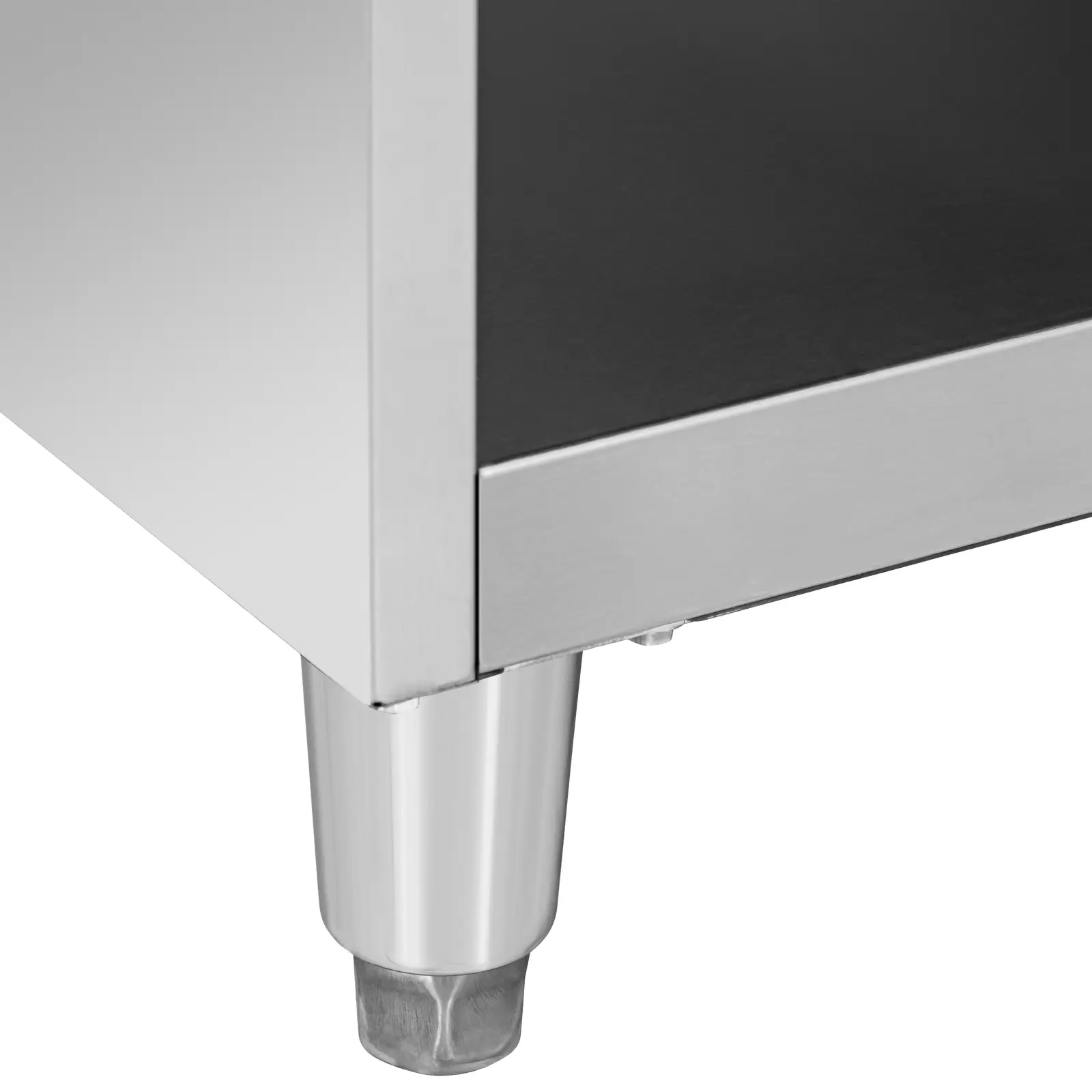 Podstawa ze stali nierdzewnej nie tylko zapewnia stabilność, ale również dużą przestrzeń do przechowywania. Wysokość nóg można regulować w zakresie od 11 do 13 cm, co pozwala na stabilne ustawienie na nierównych powierzchniach. Gumowe nóżki chronią podłogę przed zarysowaniami.