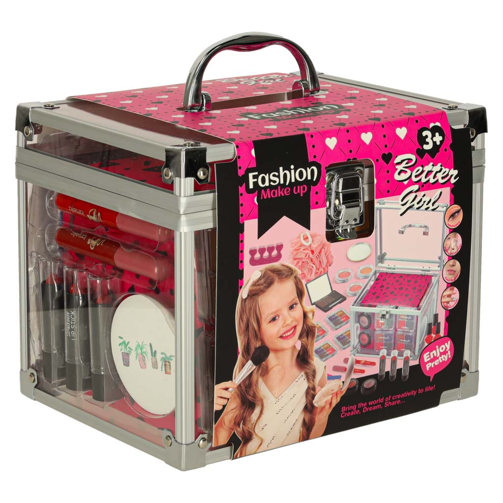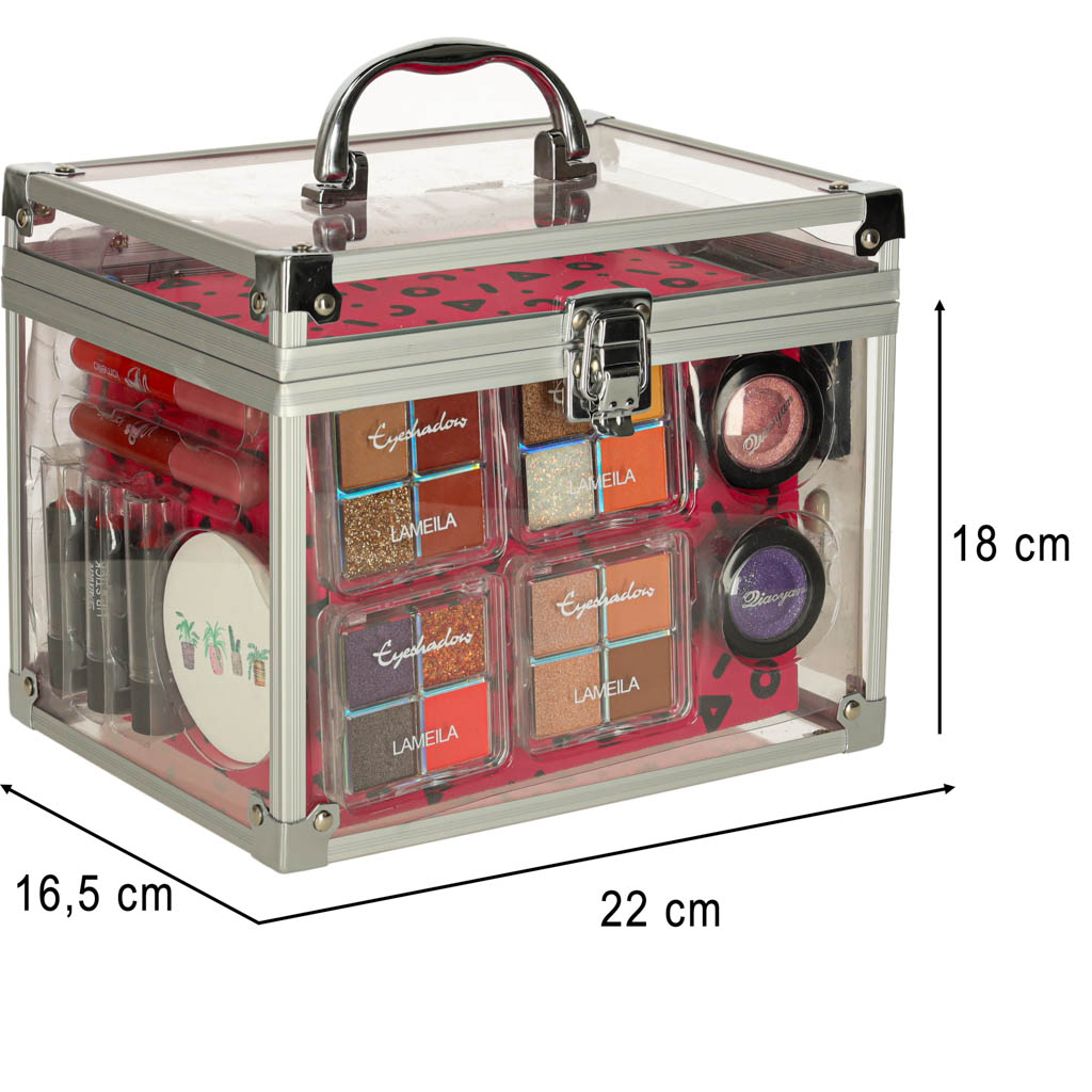 Kuferek wykonany jest z przezroczystego materiału z aluminiowym wykończeniem, co nadaje mu elegancki wygląd. Wymiary kuferka to 22 × 18 × 16,5 cm, co sprawia, że jest poręczny i łatwy do przenoszenia. Kosmetyki są nietoksyczne, hipoalergiczne i łatwo zmywalne wodą, co czyni je bezpiecznymi dla delikatnej skóry dziecka.