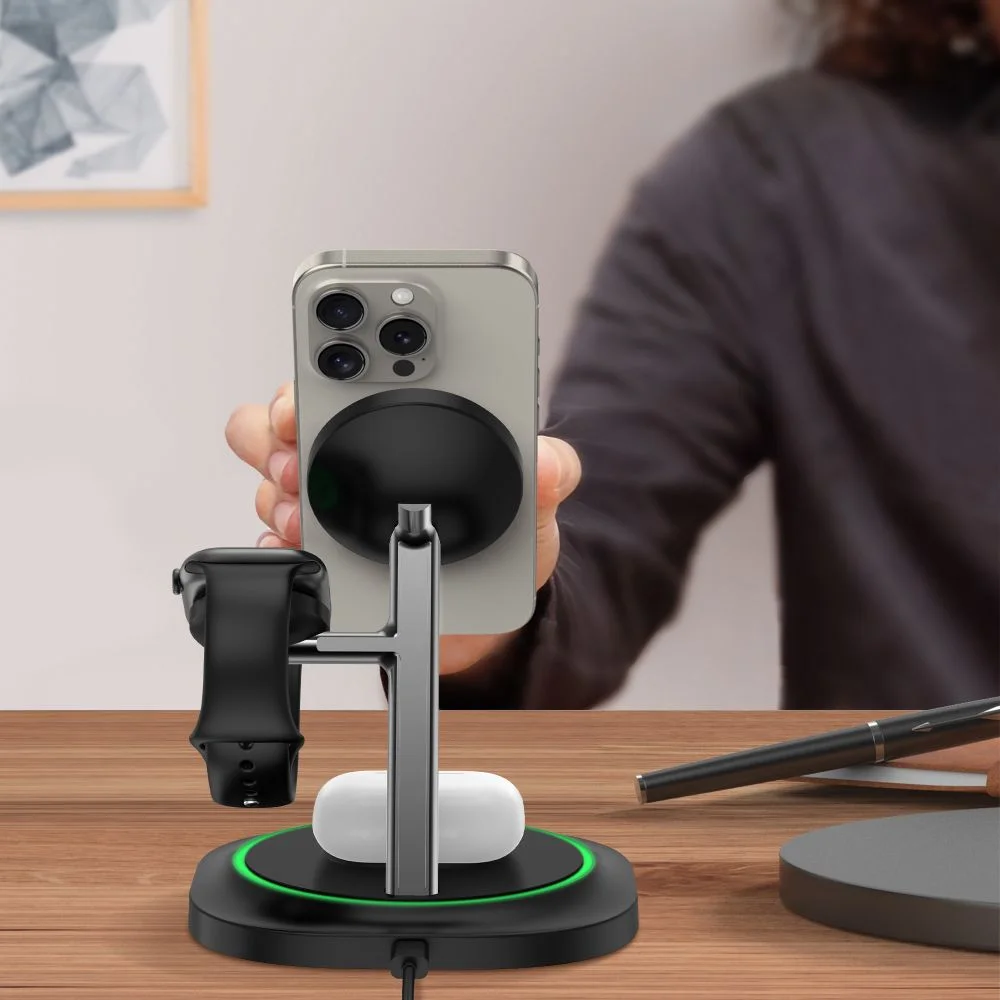 Oferujemy nowoczesną, magnetyczną ładowarkę bezprzewodową 3w1, idealną dla osób ceniących wygodę i estetykę. Dzięki możliwości równoczesnego ładowania trzech urządzeń, sprawdzi się doskonale w biurze, sypialni czy salonie.