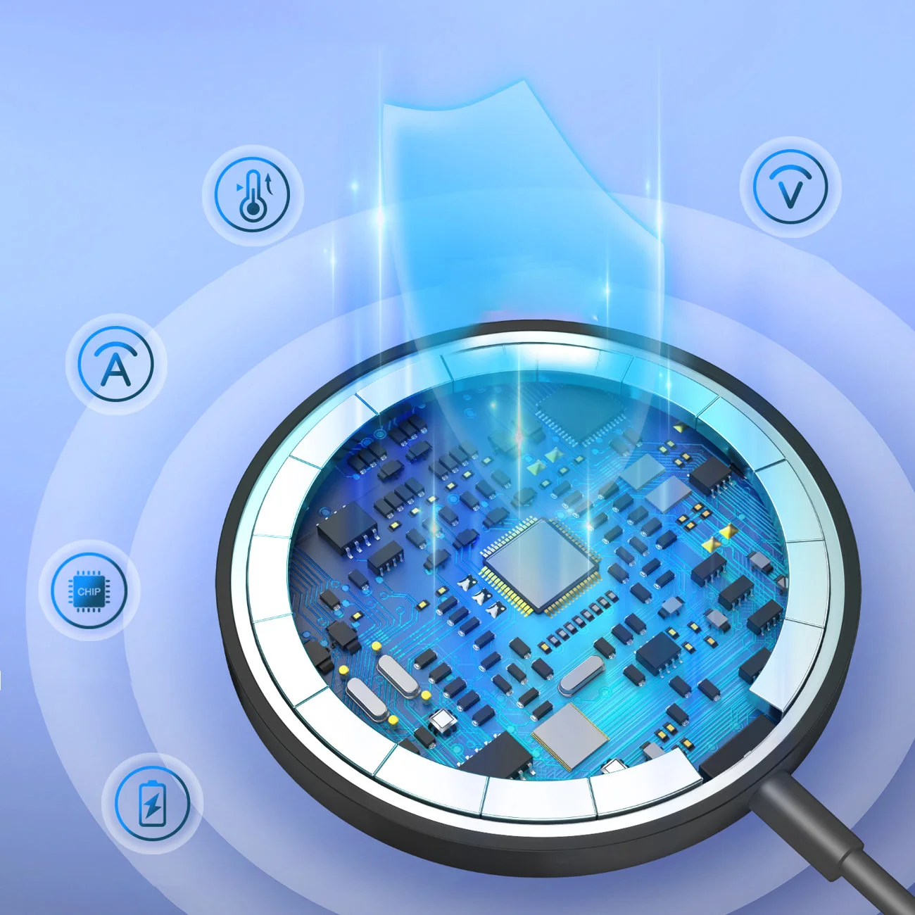 Ładowarka posiada 7 zabezpieczeń, które chronią przed przeładowaniem, wyładowaniem, przepięciami, przegrzaniem, prądem przetężeniowym, spięciami oraz polem elektromagnetycznym.