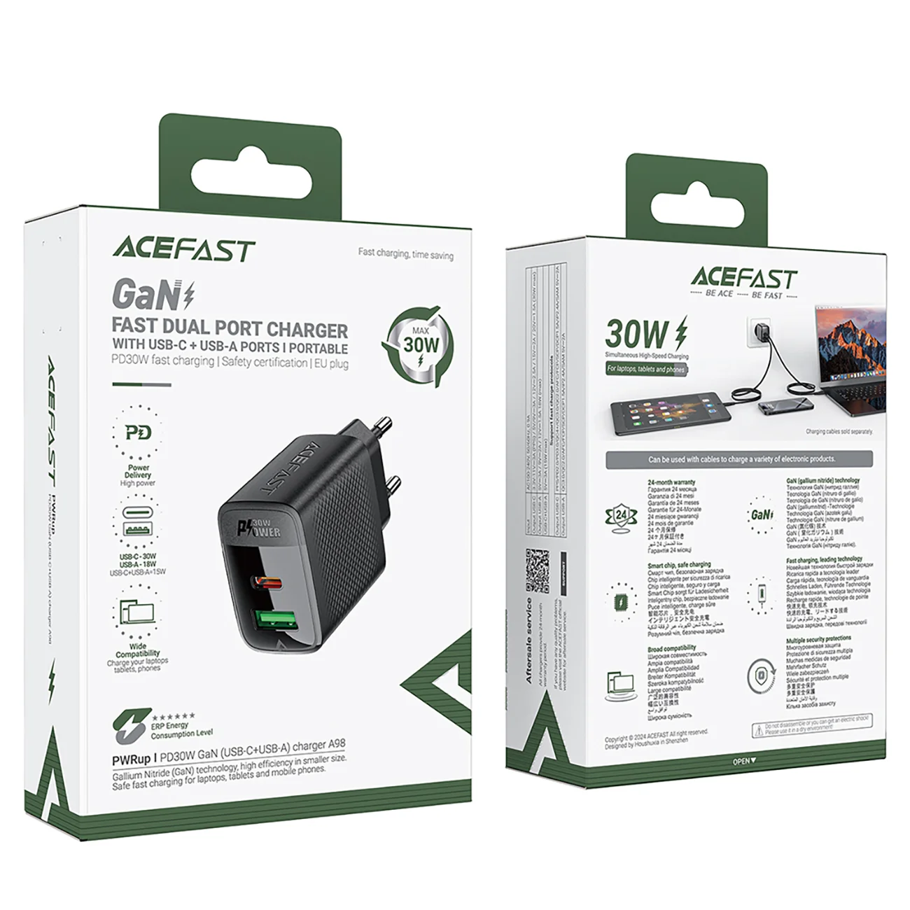 Ta kompaktowa ładowarka z dwoma portami – USB-A oraz USB-C – obsługuje szybkie ładowanie o mocy do 30W, co sprawia, że jest idealnym rozwiązaniem do ładowania: