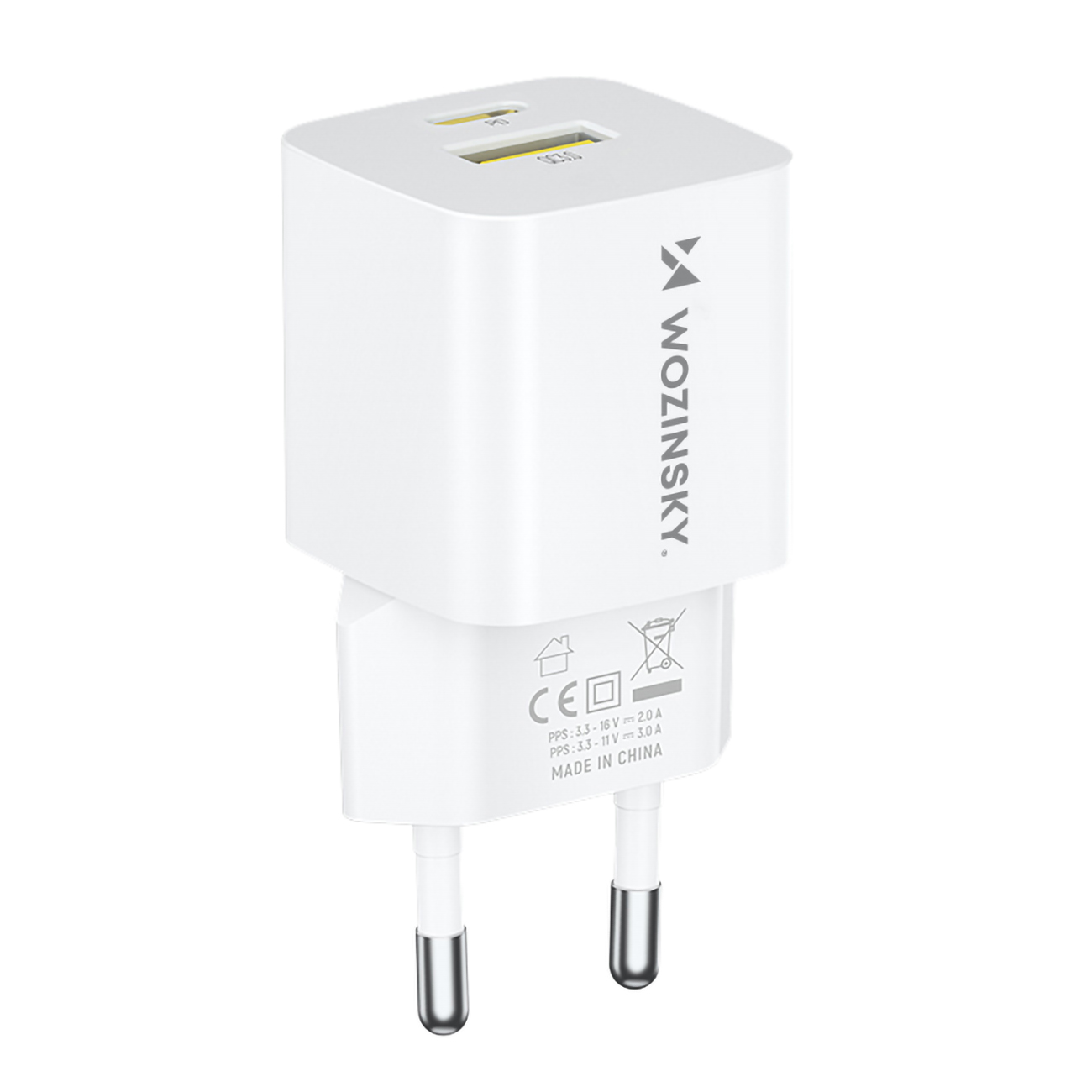 W zestawie znajduje się ładowarka sieciowa Wozinsky WWCEAC z technologią GaN, w kolorze białym.