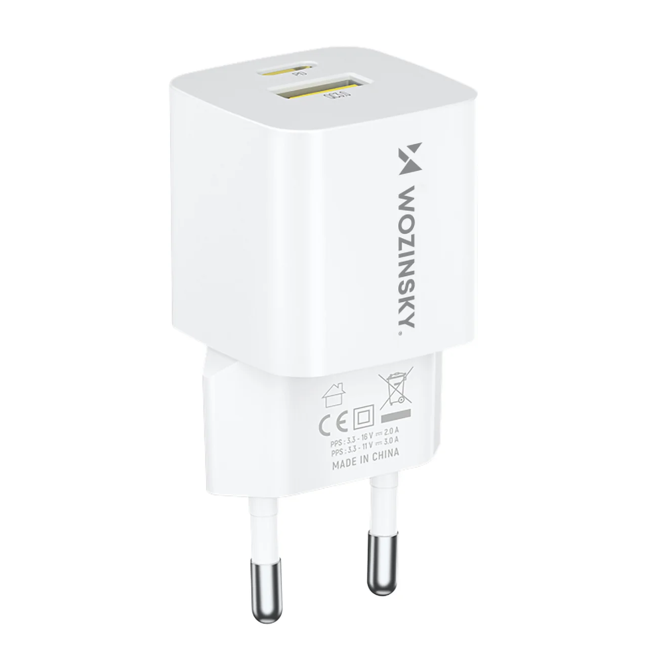 W zestawie znajduje się ładowarka sieciowa Wozinsky WWCEAC z technologią GaN, w eleganckim białym kolorze.