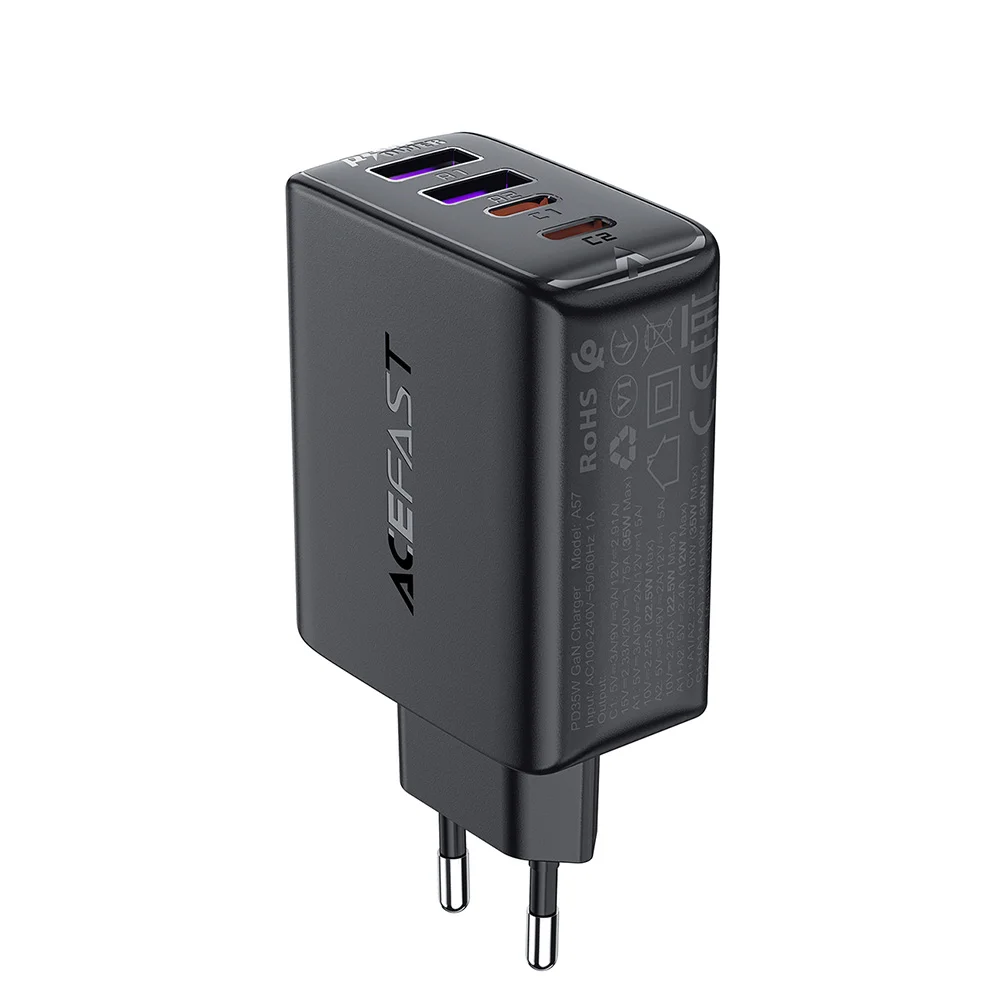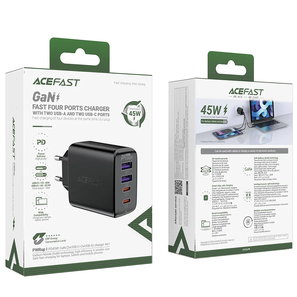 Ładowarka sieciowa PD 45W GaN z 4 portami 2x USB-C + 2x USB-A to idealne rozwiązanie dla nowoczesnych użytkowników, którzy oczekują szybkiego i wszechstronnego ładowania wielu urządzeń jednocześnie. Dzięki eleganckiemu czarnemu wykończeniu, ładowarka Acefast A61 z pewnością zaspokoi Twoje potrzeby.