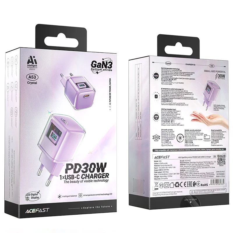 Ładowarka Acefast A53 to nowoczesne urządzenie, które zapewnia moc ładowania do 30 W. Dzięki zastosowanej technologii GaN trzeciej generacji, możesz cieszyć się wydajnym i stabilnym ładowaniem różnych urządzeń, takich jak telefony, tablety czy laptopy.