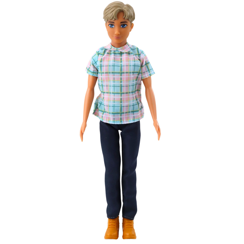 Lalka chłopiec ubrana jest w kolorową koszulę w kratkę, granatowe spodnie oraz brązowe buty. W zestawie znajdują się stylowe akcesoria: szara walizka na kółkach z wysuwaną rączką, selfie stick z telefonem, okulary przeciwsłoneczne oraz butelka wody. To idealny zestaw dla dzieci powyżej 3. roku życia – wspiera rozwój wyobraźni, umiejętności społeczne oraz odgrywanie ról.
