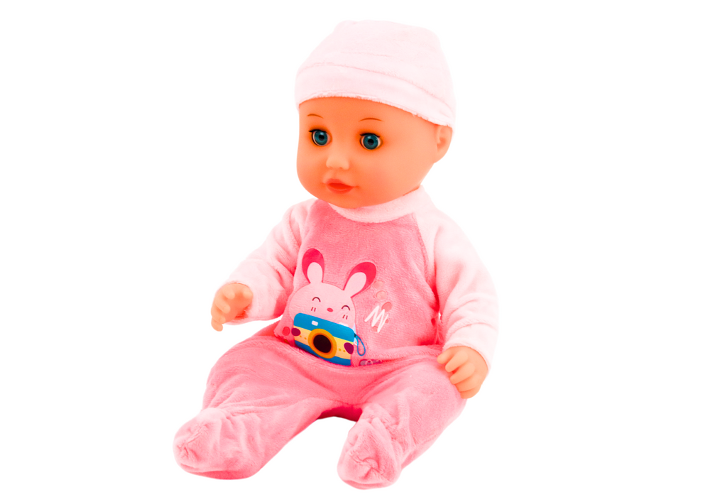 Na brzuszku lalki znajduje się głośniczek, który po naciśnięciu guzika wydaje różne dźwięki, imitujące emocje i zachowania niemowlaka, co rozwija wyobraźnię dziecka.