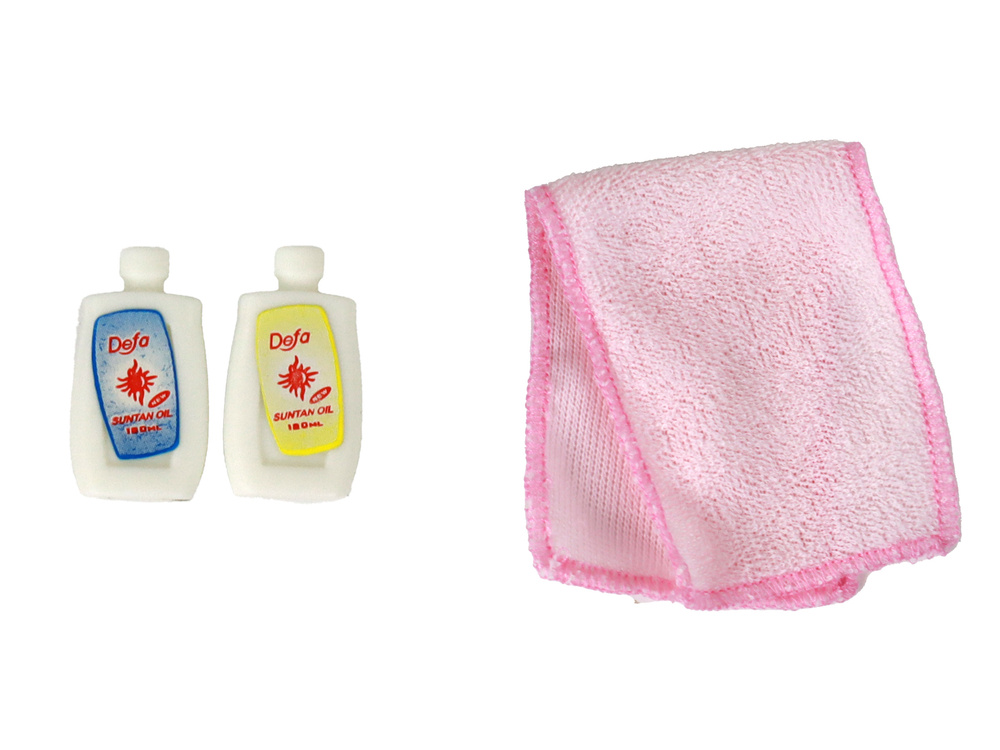 W zestawie znajdują się dodatki, które umożliwiają pełną opiekę nad lalką. Różowy ręcznik, niebieska szczotka do włosów, 2 olejki do opalania, jeansowe spodenki, bluzka z krótkim rękawkiem, biała wanna o wymiarach 23 cm x 10 cm x 13 cm.