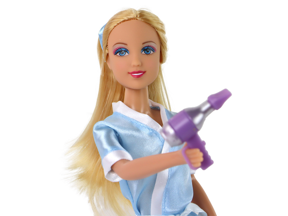 Lalka jest starannie pomalowana na twarzy, z delikatnym makijażem w odcieniach niebieskiego, co nadaje jej subtelności i wyrazistości. W zestawie znajdują się dodatki, które umożliwiają pełną opiekę nad lalką. Biały ręcznik, fioletowa szczotka, zamienne fioletowe buty na szpilkach, suszarka do włosów, biała wanna o wymiarach 23 cm x 10 cm x 13 cm, toaleta z fioletową klapą oraz umywalka z fioletowo-różową szafką i lustrem o wymiarach 29 cm x 11 cm x 5 cm.