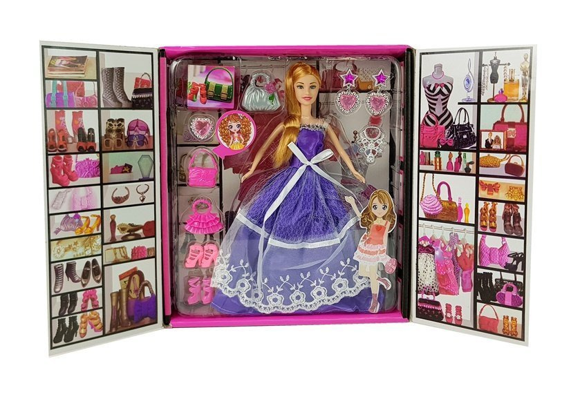 Zabawkowa lalka posiada gęste i długie włosy w jasnym kolorze, a także dziewczęcą twarz ozdobioną lekkim makijażem. Wygląda jak księżniczka! Ubrana jest w długą suknię balową w kolorze fioletu i białą koronką. Pełna elegancji i dodatków, może wybrać się na wystawny bal i zachwycić wszystkich wokół. Zestaw składa się z imponujących dodatków, które można dodawać wedle własnego gustu. Pudełko jest otwierane, tak jak szafa, wewnątrz obrazki imitujące szafę. Dziecko spokojnie może tu przechowywać lalkę z akcesoriami.