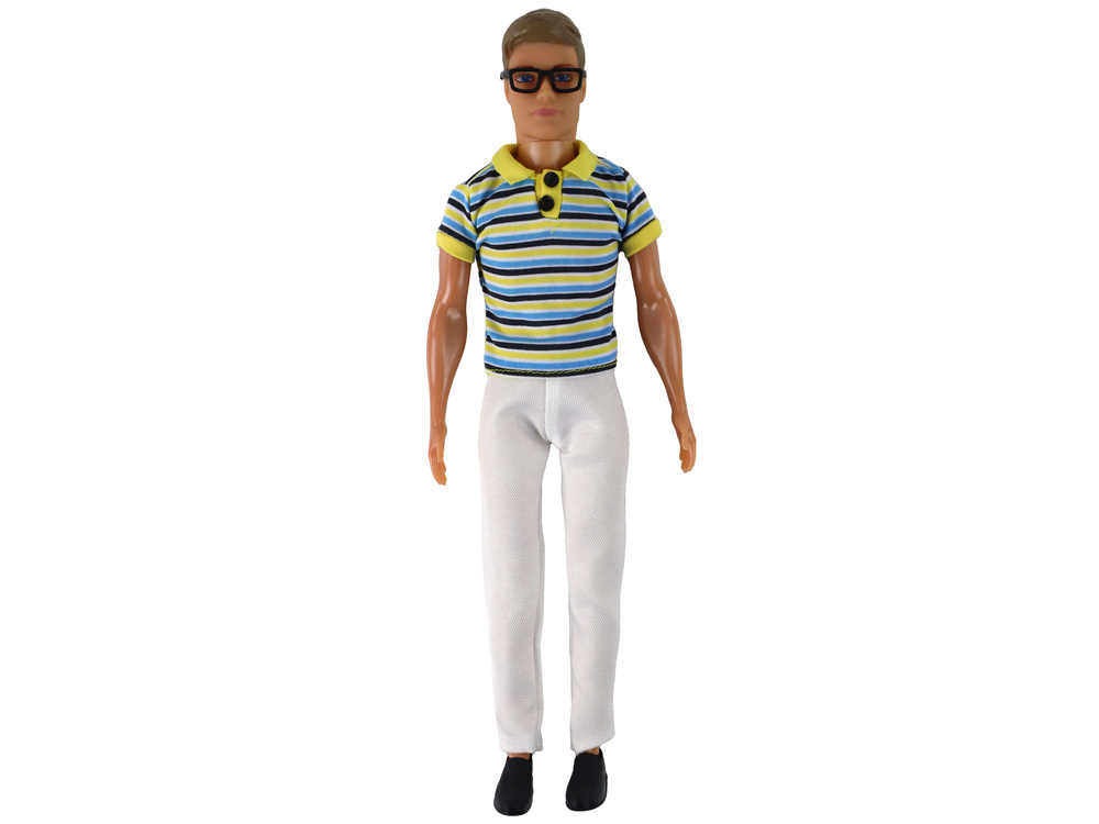 Lalka chłopak Kevin nosi eleganckie czarne buty i czarne okulary, co nadaje mu charakteru.