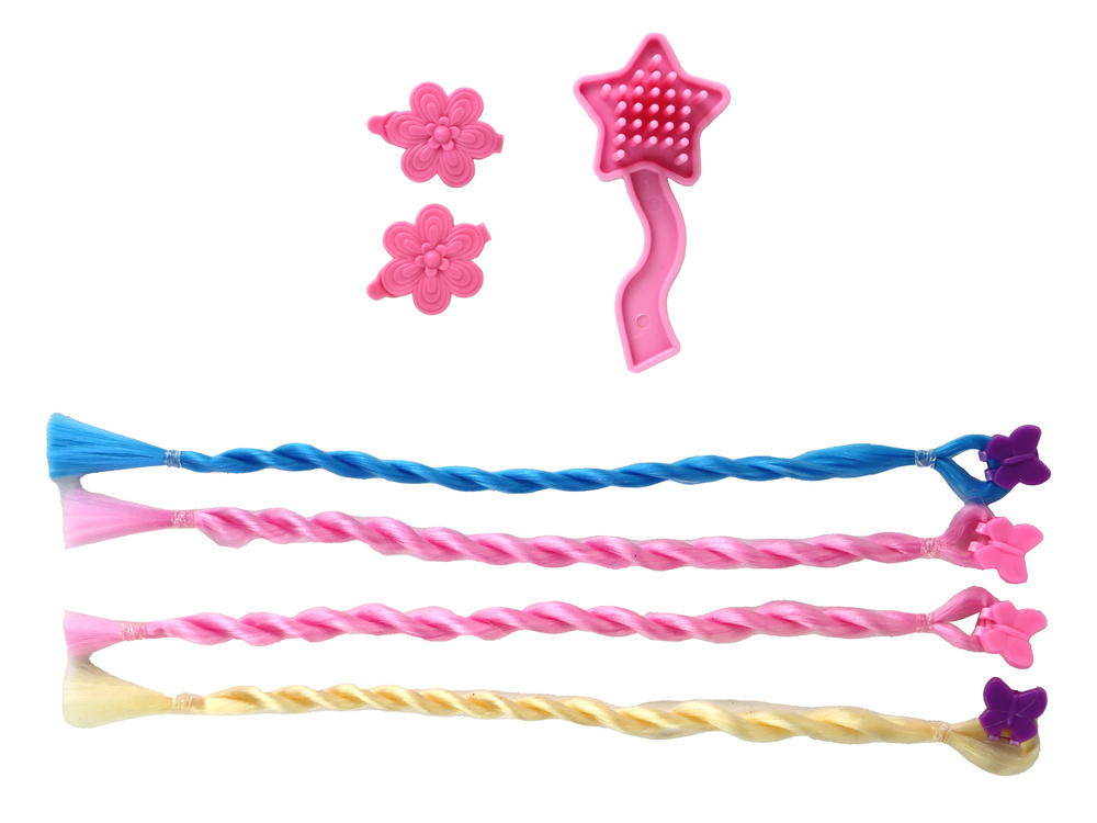 W zestawie znajduje się różowa szczotka, która pozwala na pielęgnację i układanie włosów lalki. Spinki do włosów w kolorze różowym pozwalają na tworzenie różnych fryzur i ozdabianie włosów lalki. Dodatkowo w zestawie są 4 pasma doczepianych włosów o różnych kolorach: różowe, niebieskie i w kolorze blond, co daje możliwość eksperymentowania z fryzurami i stylizacjami.