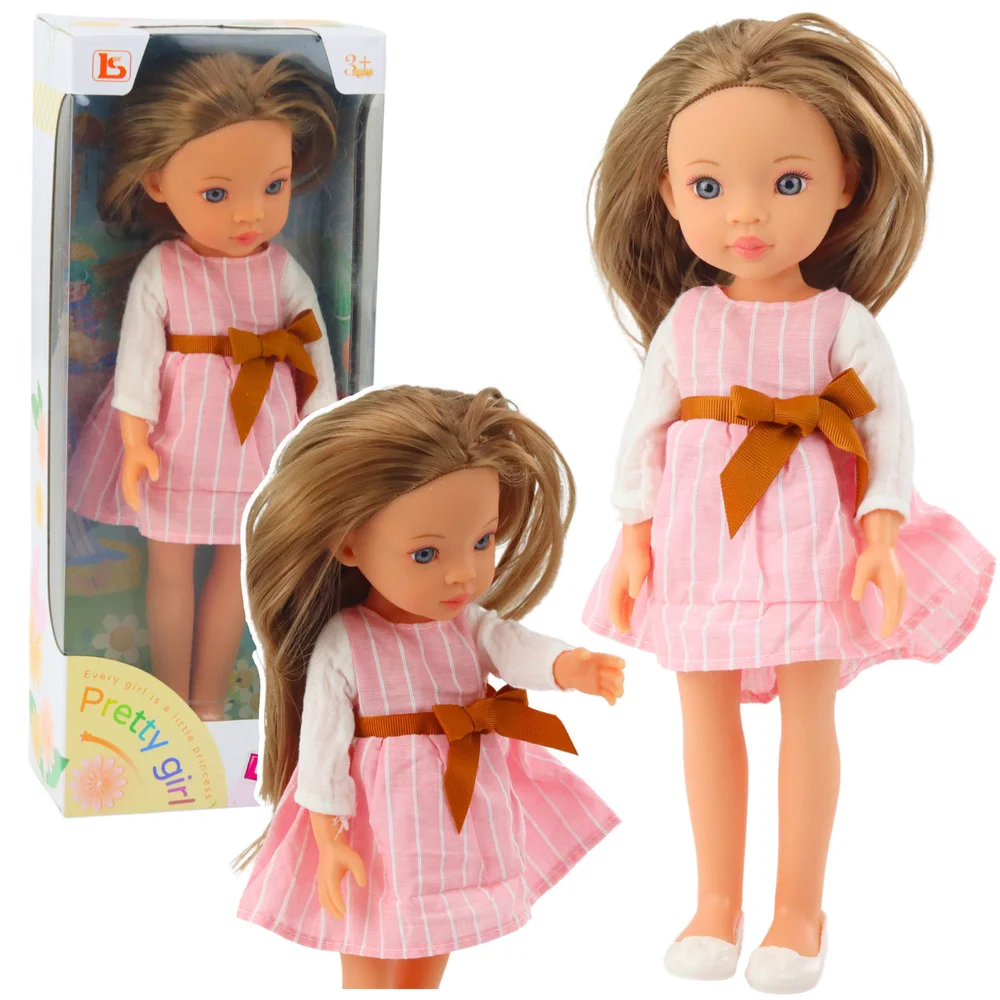 Lalka W Różowej Sukience z Kokardą Długie Brązowe Włosy