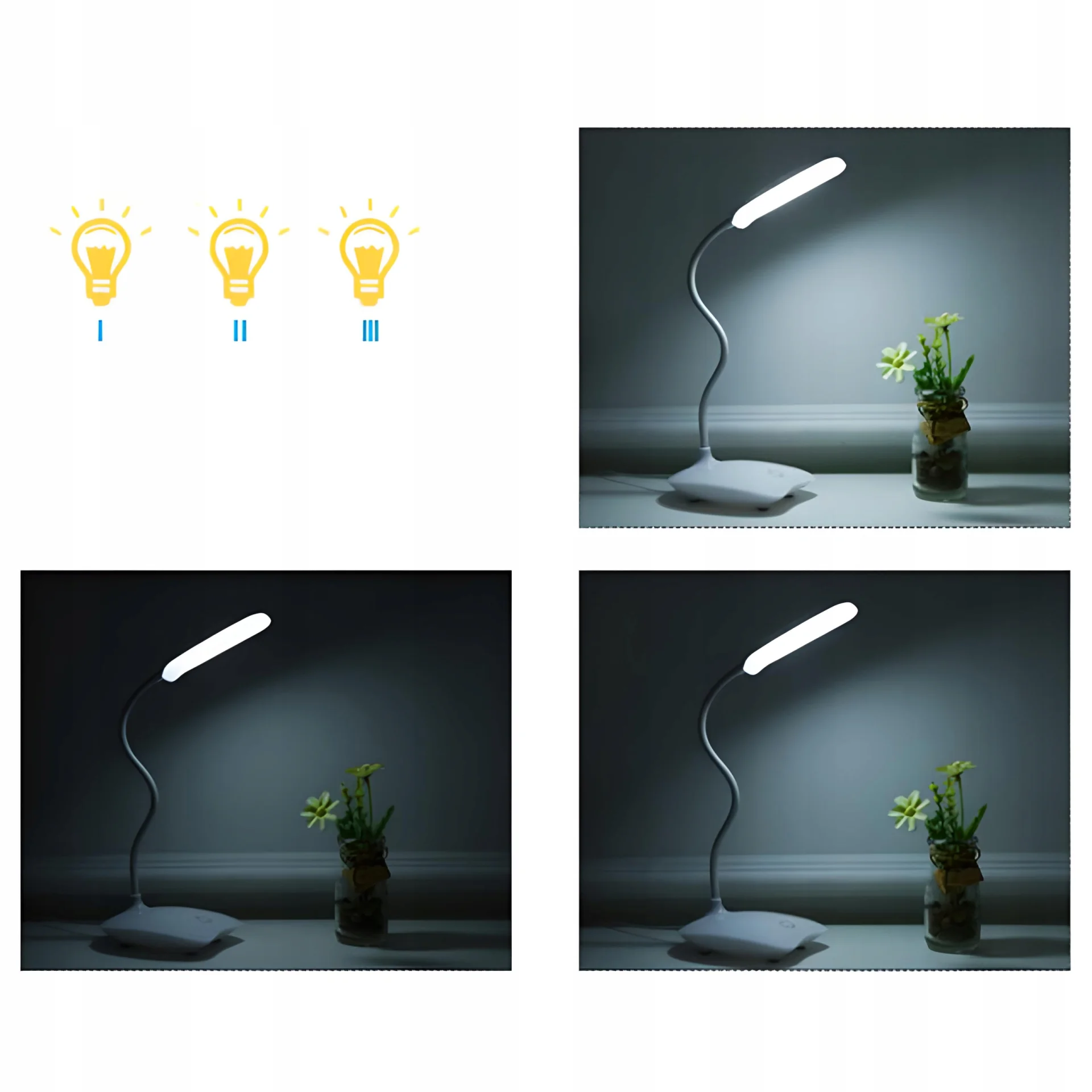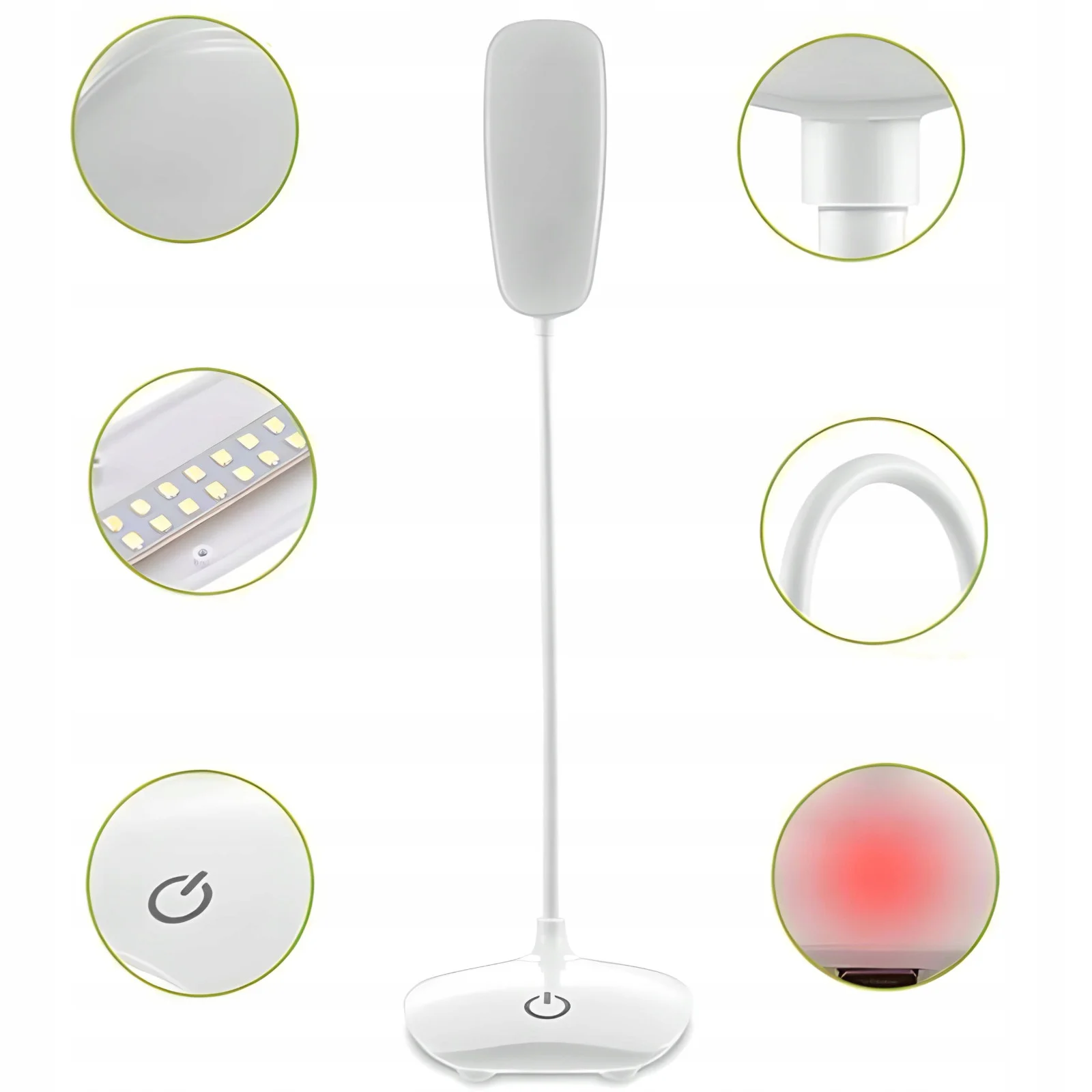 Elastyczne ramię lampy umożliwia dostosowanie kąta padania światła według potrzeb użytkownika. Dzięki wbudowanemu akumulatorowi, można korzystać z lampki również w terenie, np. podczas campingu, bez konieczności posiadania dostępu do stałego źródła zasilania.