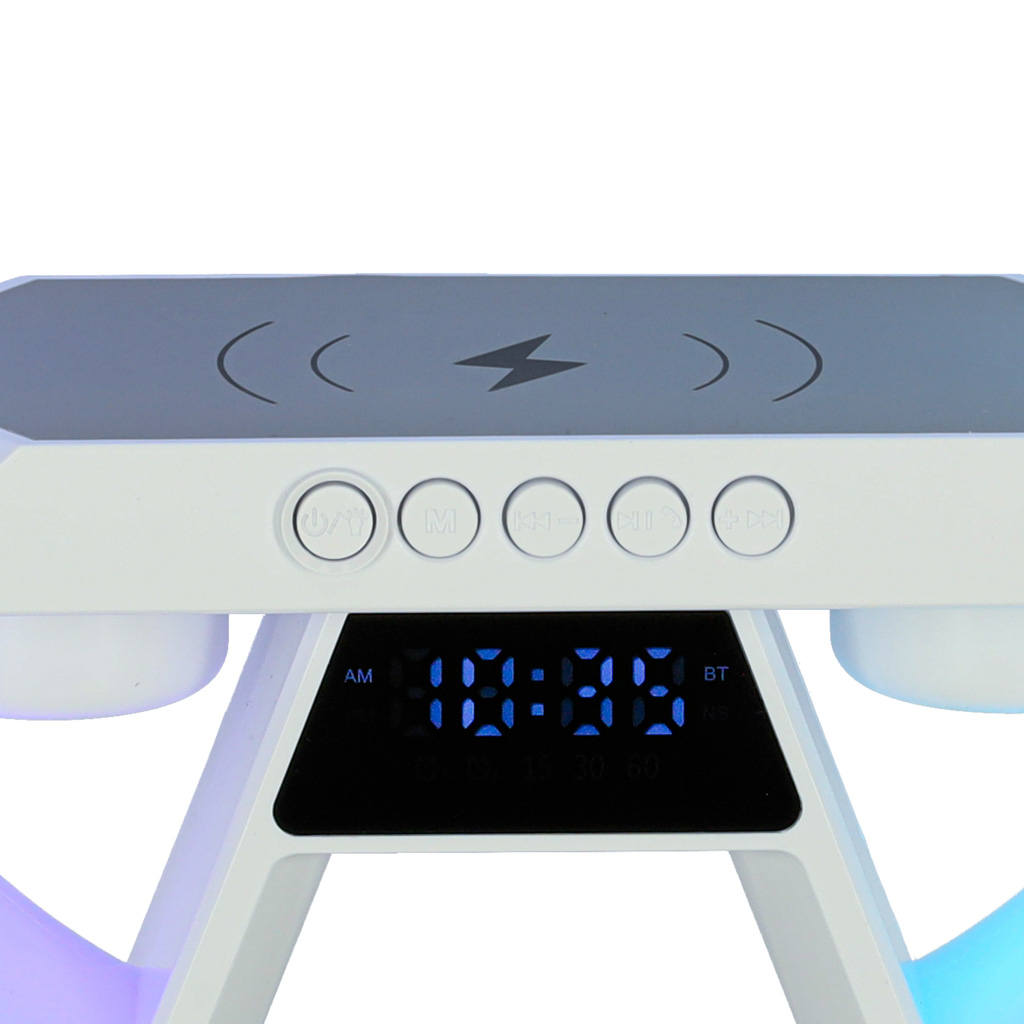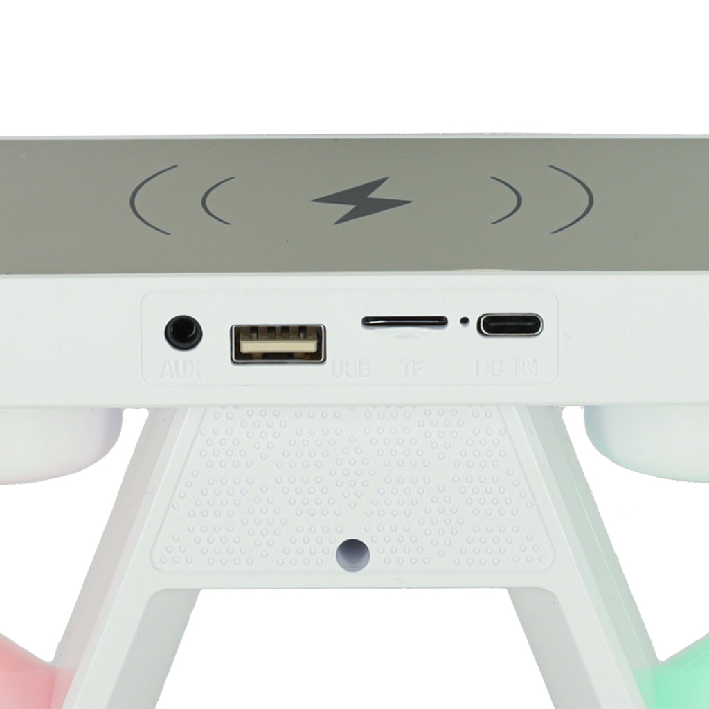 Lampka RGB oferuje różne tryby oświetlenia, a także bezprzewodowe ładowanie indukcyjne, które umożliwia naładowanie telefonu obsługującego technologię Qi. Dodatkowo, wbudowane radio FM oraz głośnik pozwalają na odtwarzanie muzyki przez Bluetooth lub kartę SD.