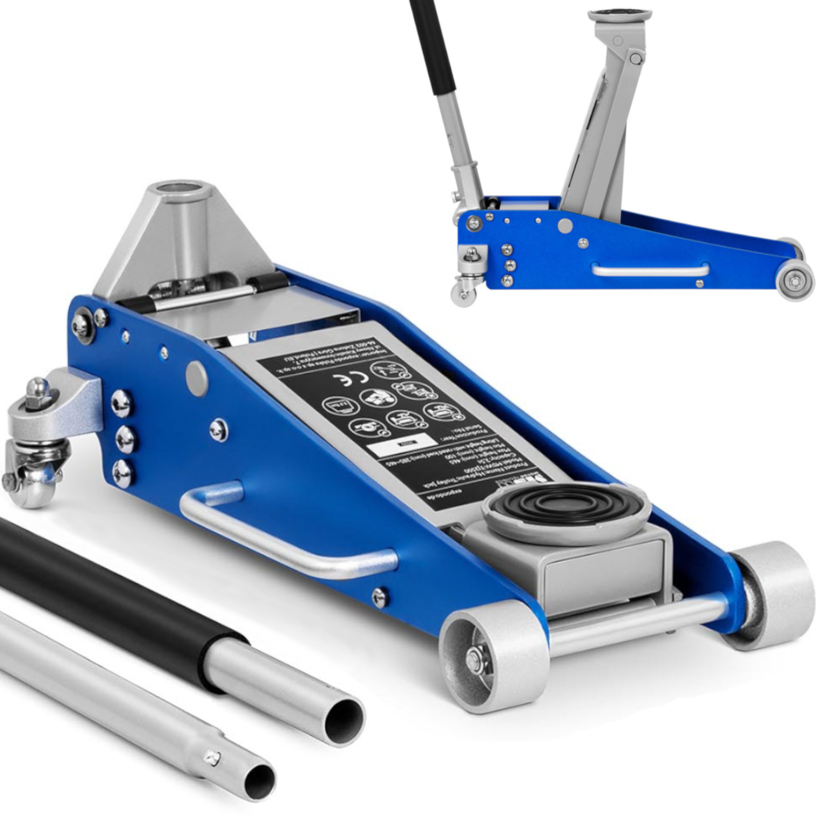 Solidna konstrukcja z aluminium gwarantuje trwałość, a wbudowane koła ułatwiają przesuwanie podnośnika pod samochody. W zestawie znajduje się podnośnik, dźwignia oraz instrukcja obsługi.