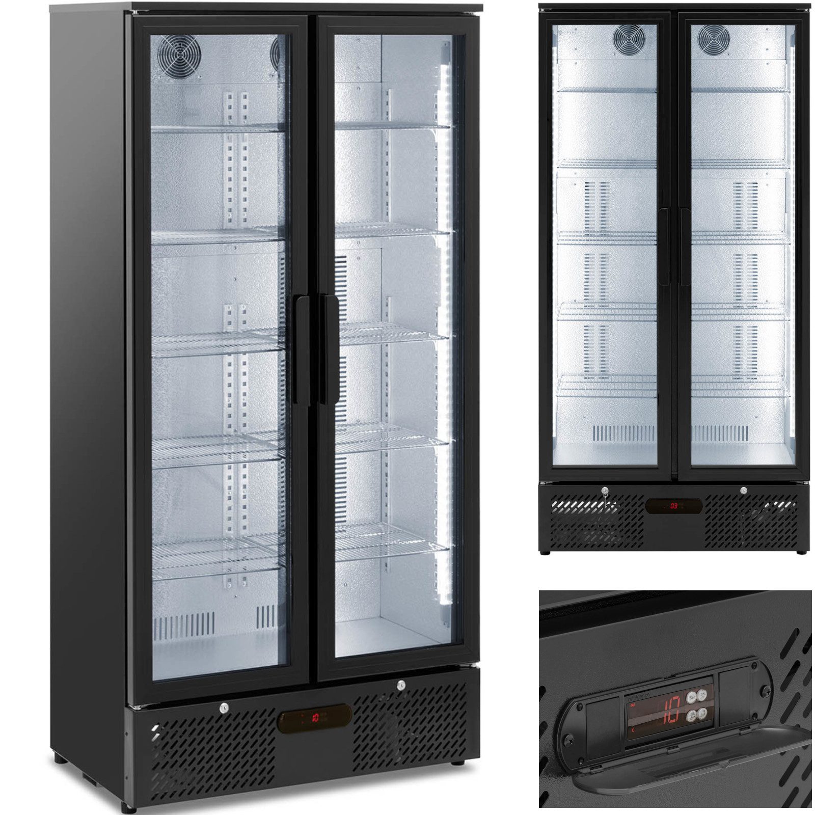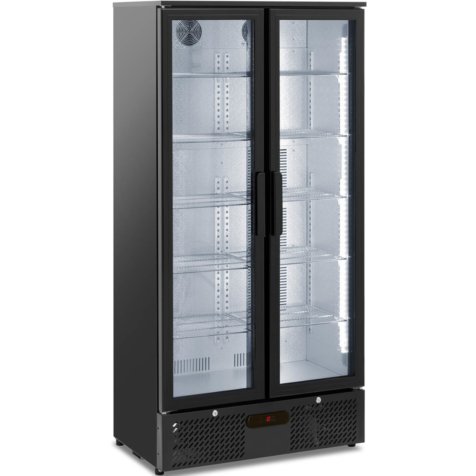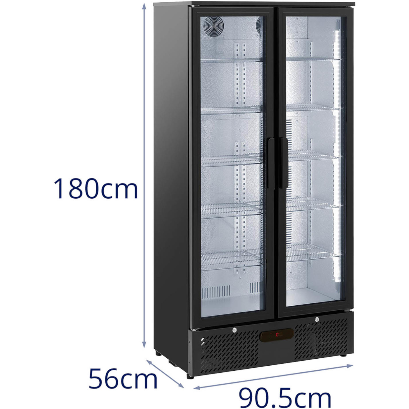 Lodówka chłodziarka barowa na napoje 2-drzwiowa przeszklona 458 l 295 W to doskonały wybór do eksponowania napojów w barach, restauracjach czy biurach. Jej elegancki czarny design oraz nastrojowe oświetlenie LED przyciągają uwagę, a wnętrze o pojemności 458 l z 10 półkami zapewnia przestrzeń na butelki o różnych rozmiarach.