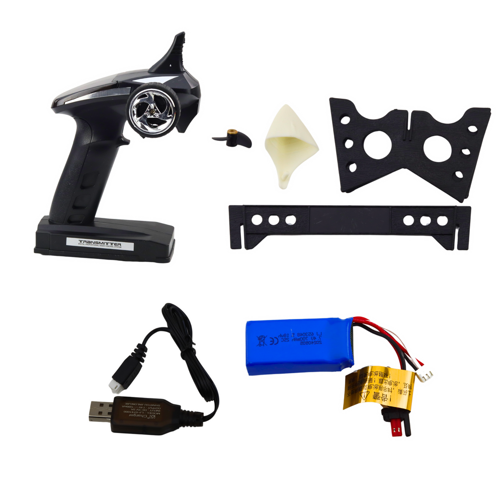 Model został wyposażony w wymienną śrubę napędową oraz element wzmacniający dziób, zwiększający trwałość podczas kontaktu z przeszkodami. Całość zapakowana jest w estetyczne pudełko – idealne również na prezent.