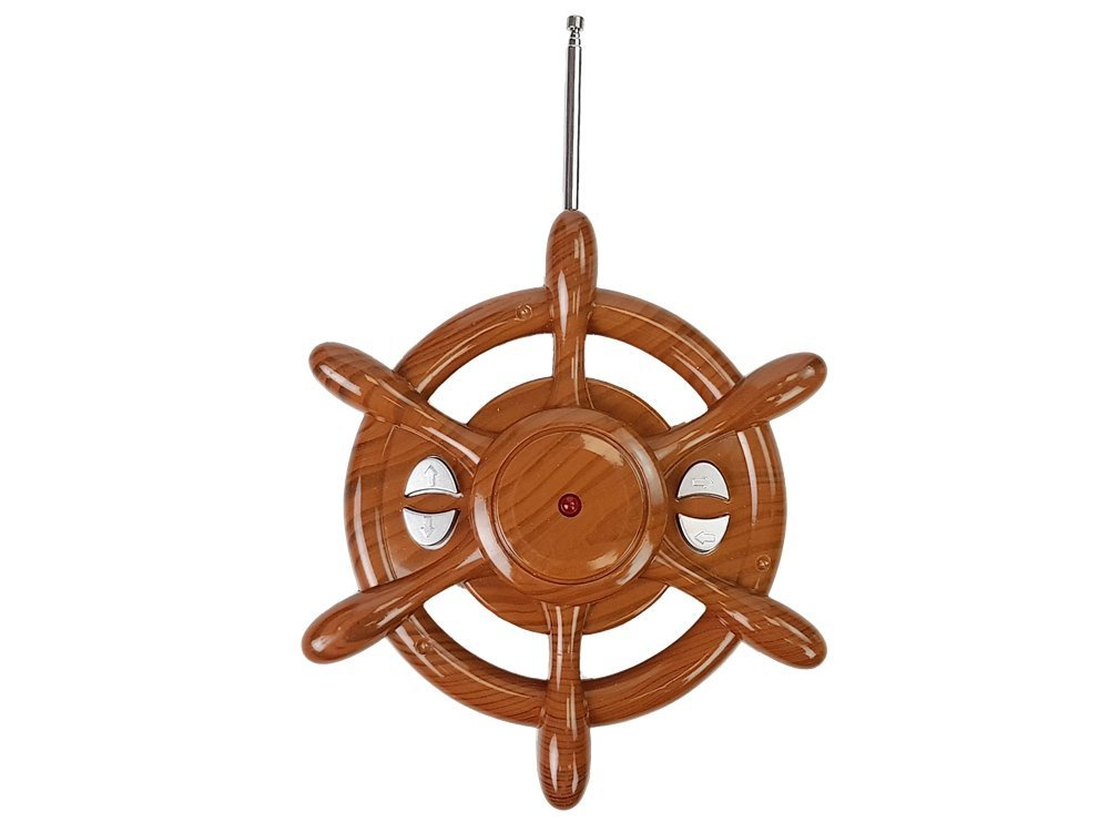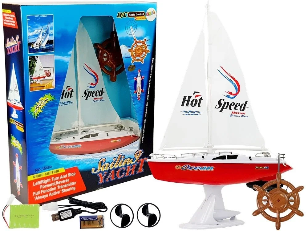 Zdalnie sterowana żaglówka wykonana jest z jednego kawałka plastiku, dzięki czemu nie ma w jej konstrukcji żadnych otworów umożliwiających nabranie wody. Każdy szczegół, nawet żagiel jest idealnie odwzorowany. Poruszanie po wodzie umożliwiają 2 silniki z tyłu zabawki. Łódkę uruchamia się przyciskiem znajdującym się w jej tylnej części, dzięki czemu nie rzuca się on w oczy. Pilot ma kształt steru, dziecko może zostań kapitanem własnej łodzi. Posiada antenę, dzięki czemu wzmacnia zasięg sterowania. Można sterować nią w przód, zawracać oraz płynąć na boki. Po skończonej zabawie może być idealną ozdobną w pokoju, dzięki podstawce w zestawie.