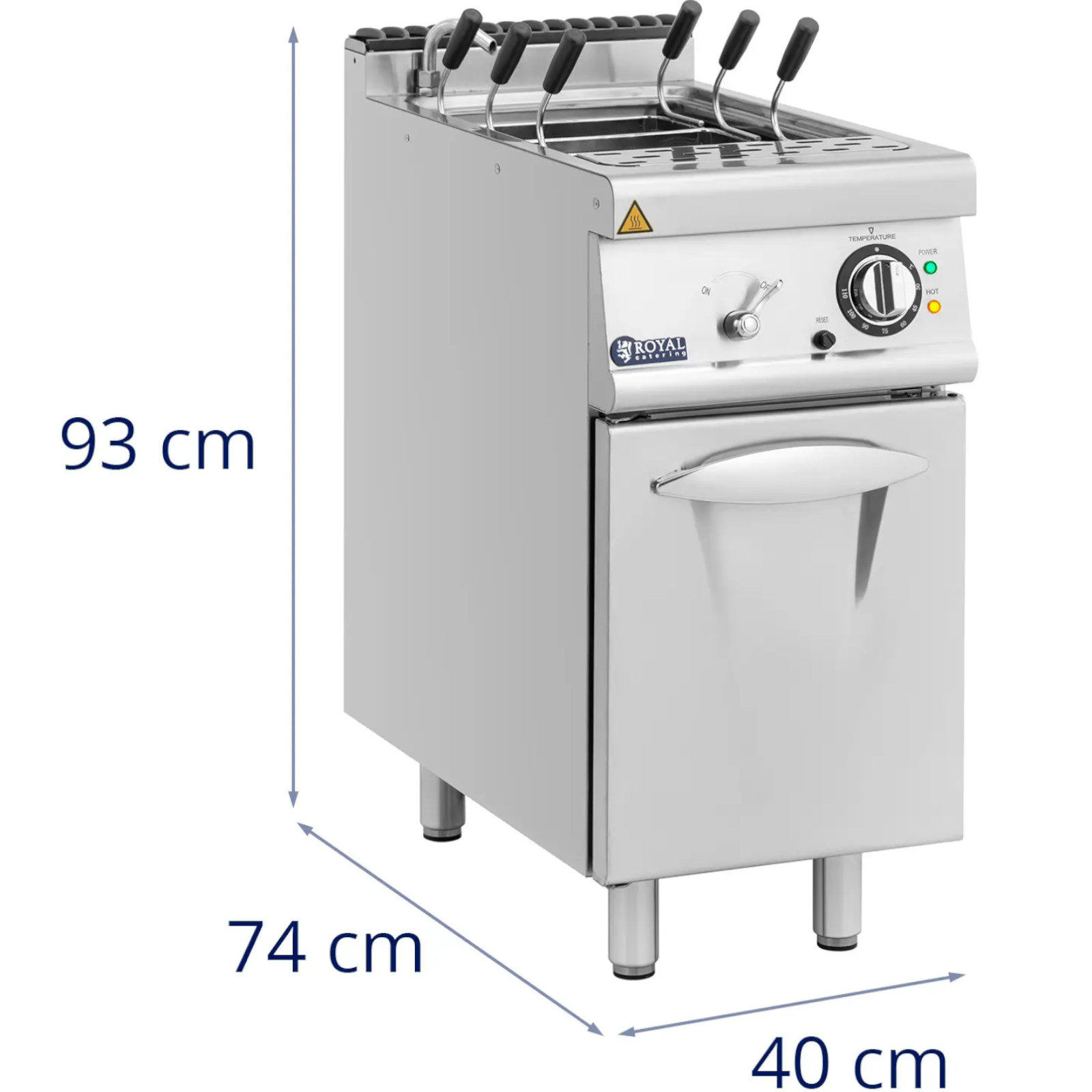 Warnik do makaronu z serii Pro 730 marki Royal Catering to idealne rozwiązanie dla profesjonalnych kuchni. Dzięki funkcjonalnemu designowi i dużej przestrzeni do przechowywania, doskonale wpisuje się w standardowe meble kuchenne. Jego wysokość wynosi 90 cm, a głębokość 73 cm, co ułatwia integrację z istniejącym wyposażeniem.