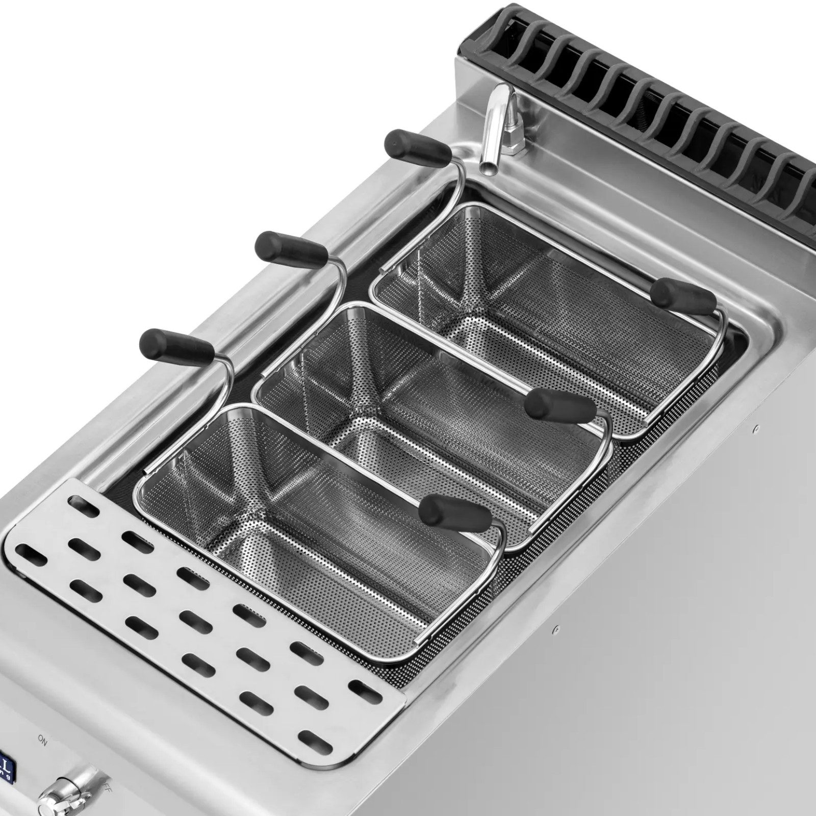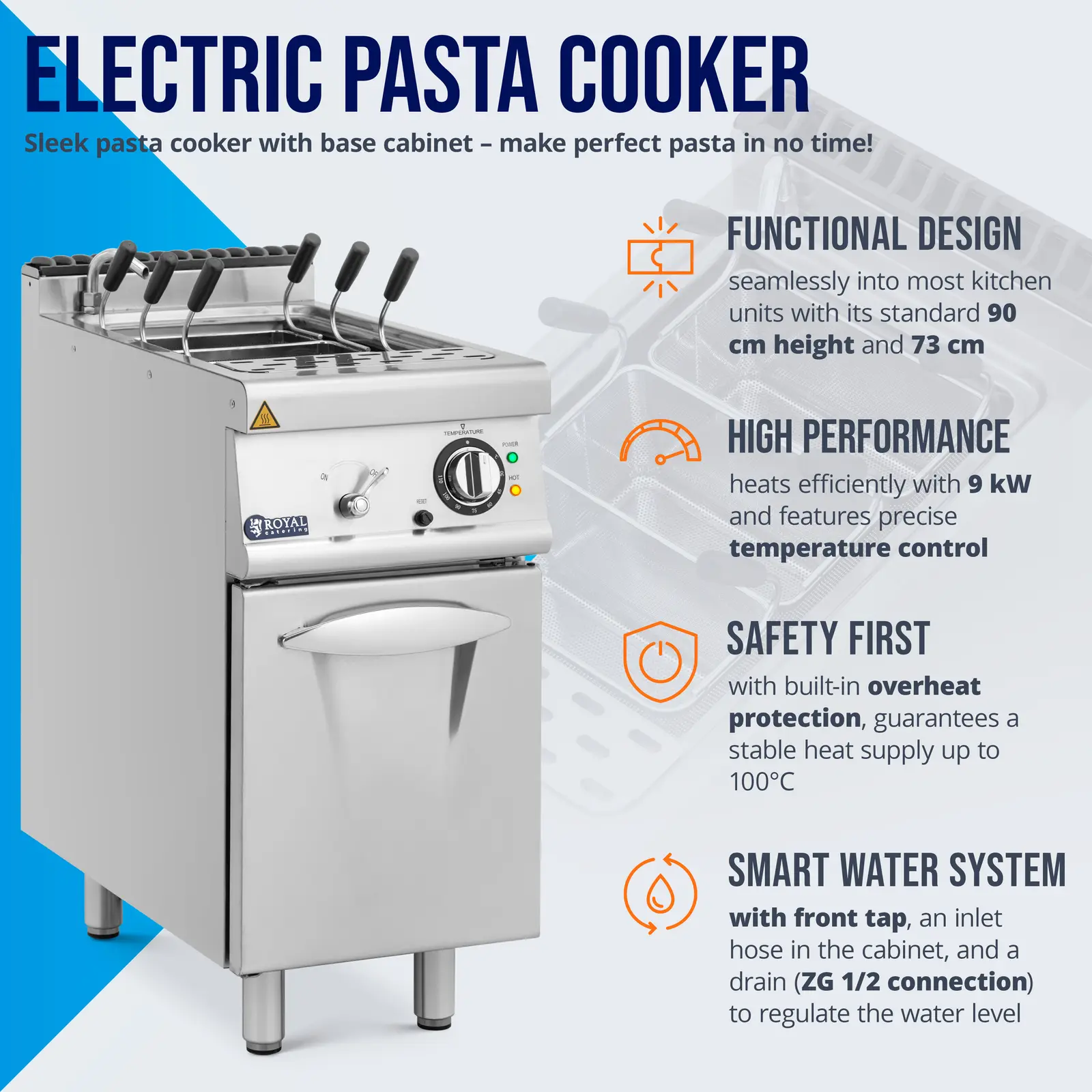 Urządzenie charakteryzuje się mocą 9 kW, co pozwala na szybkie osiąganie pożądanej temperatury. Dodatkowo, zintegrowane zabezpieczenie przed przegrzaniem zapewnia bezpieczeństwo podczas użytkowania. Warnik umożliwia gotowanie makaronu w trzech koszykach oraz dwóch osobnych pojemnikach na wodę, co pozwala na jednoczesne przygotowanie różnych ilości makaronu.