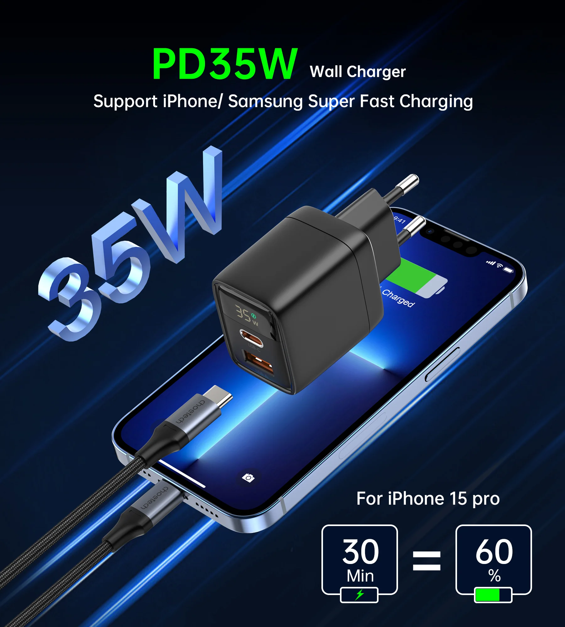 Mała mocna ładowarka sieciowa GaN USB-A USB-C PD 35W z wyświetlaczem to idealne rozwiązanie dla osób poszukujących szybkiego i wydajnego ładowania dwóch urządzeń jednocześnie. Jej nowoczesny design oraz zaawansowane technologie sprawiają, że korzystanie z niej staje się nie tylko komfortowe, ale i bezpieczne.