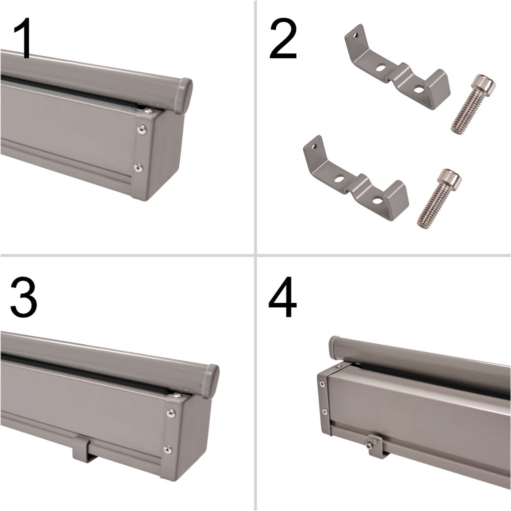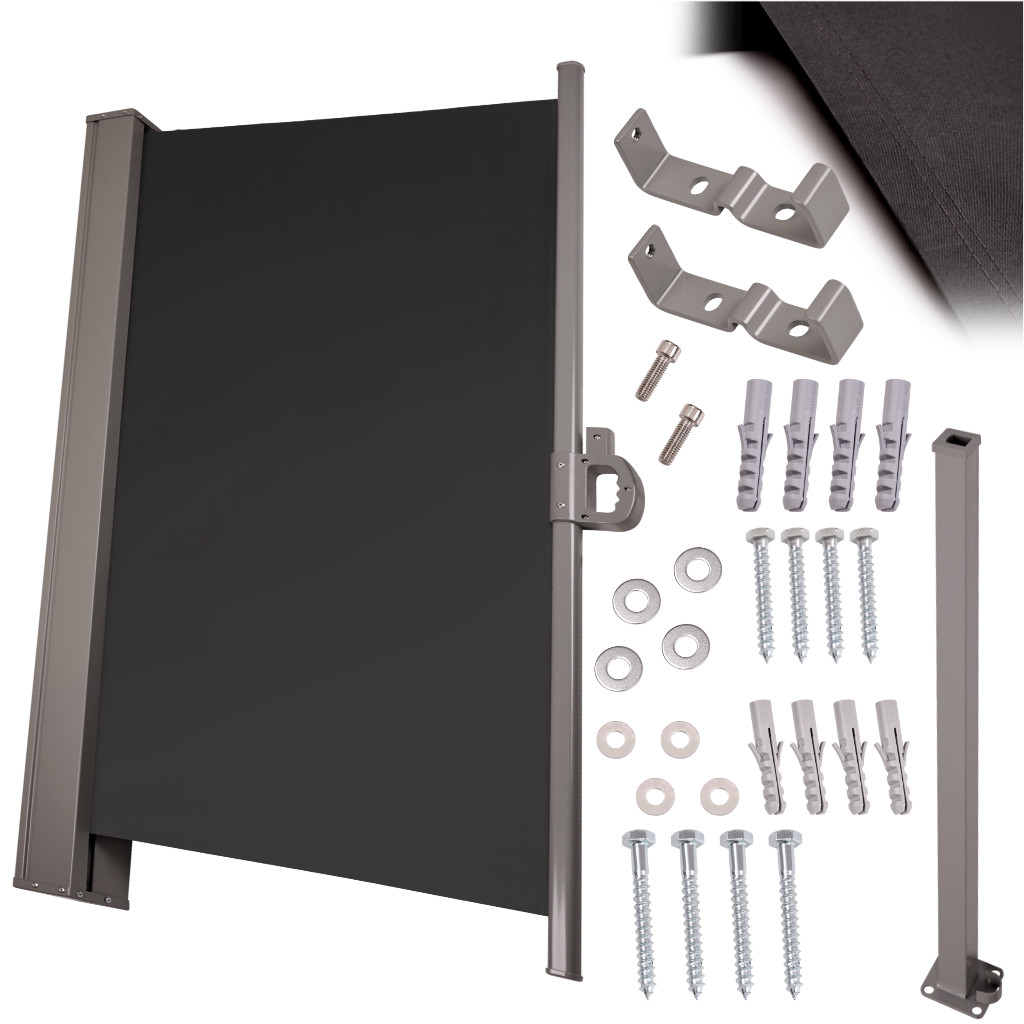 Markiza boczna jest łatwa w montażu. W zestawie znajdują się wszystkie niezbędne akcesoria, w tym słupek do montażu oraz płytka mocująca, co zapewnia prostotę i bezpieczeństwo użytkowania.